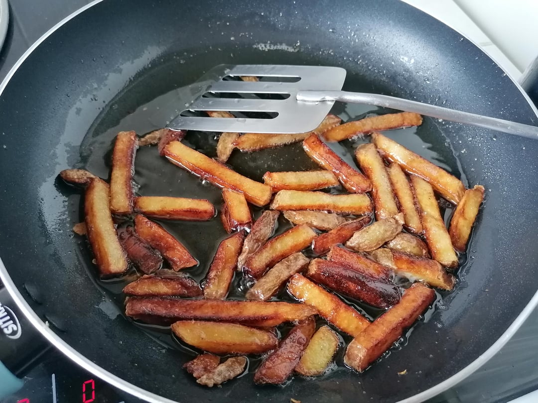 J’ai voulu essayer de faire frire mes frites à la poêle et ça a bien fonctionné, j’ai mis le reste de l’huile dans un autre pot.