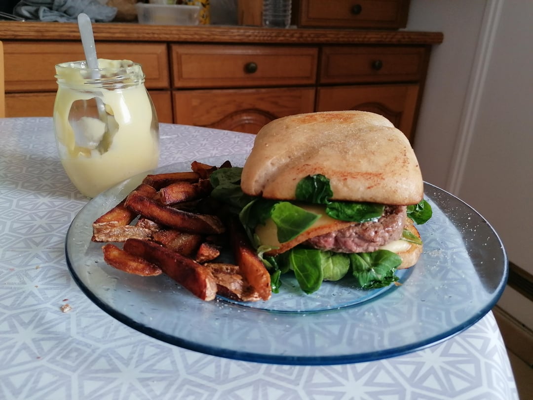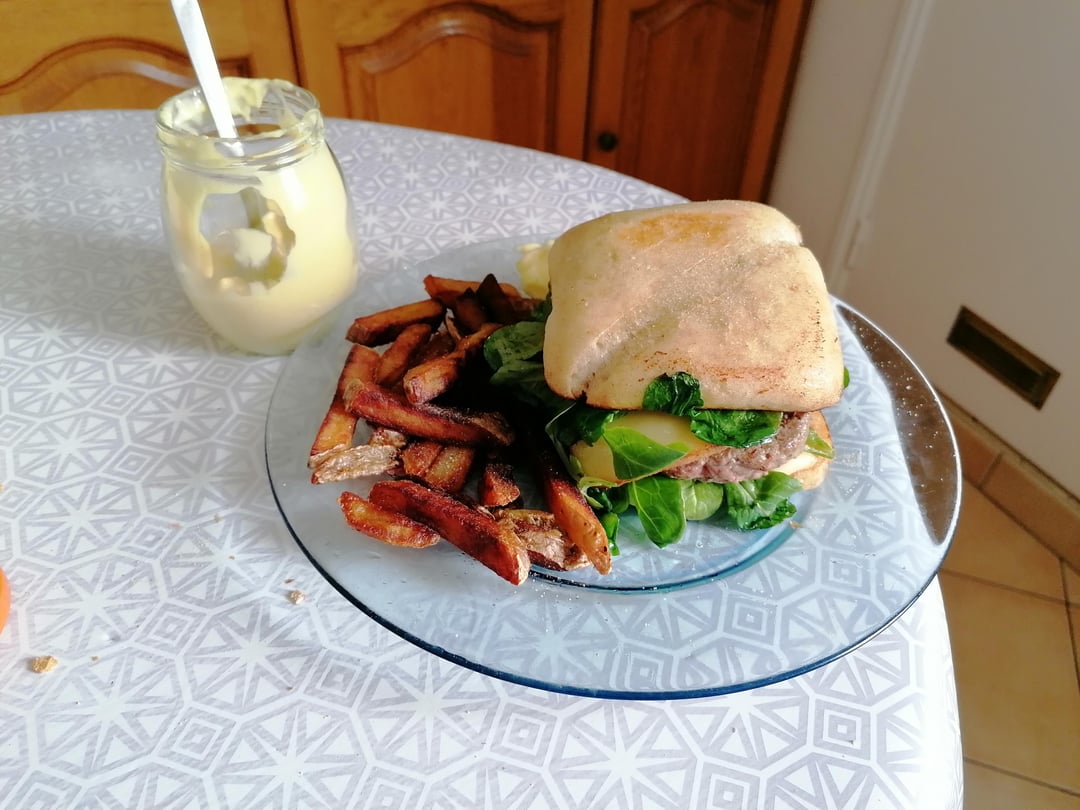 Hamburger avec mâche, fromage à raclette (ça fond bien), mayonnaise (maison) et steak haché.