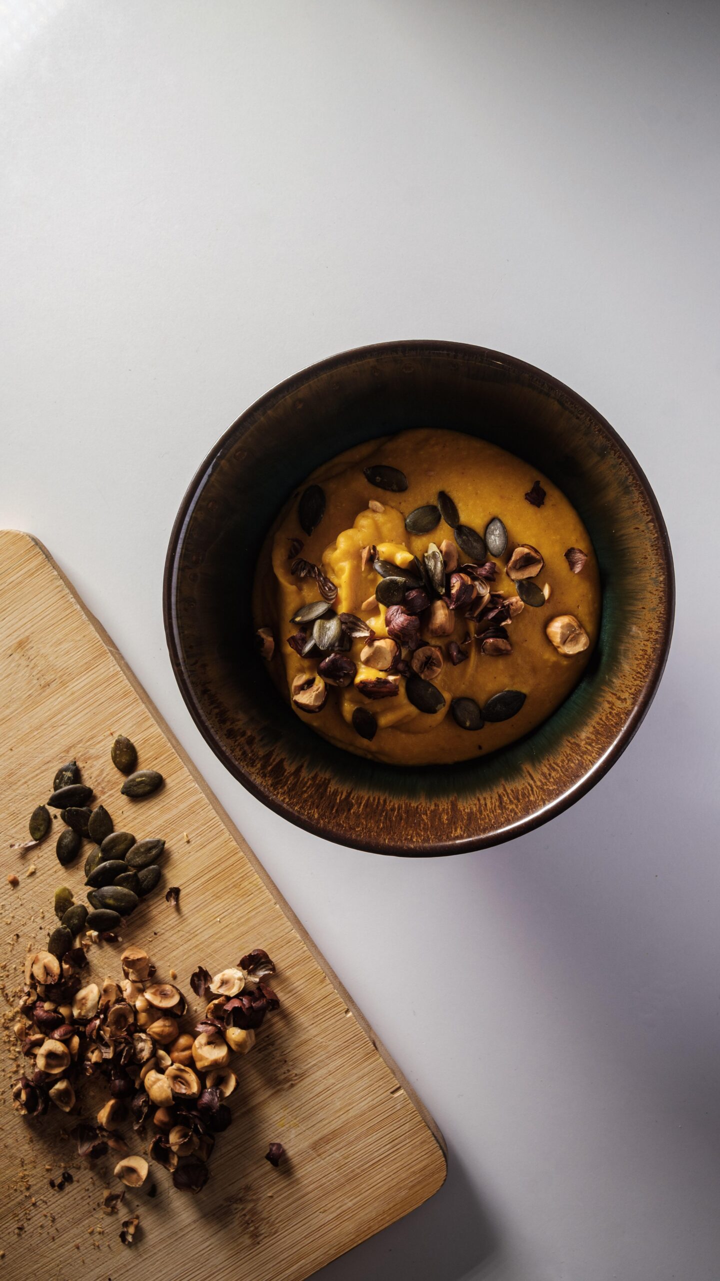 – Dresser dans un bol avec quelques noisettes concassées et graines de courge