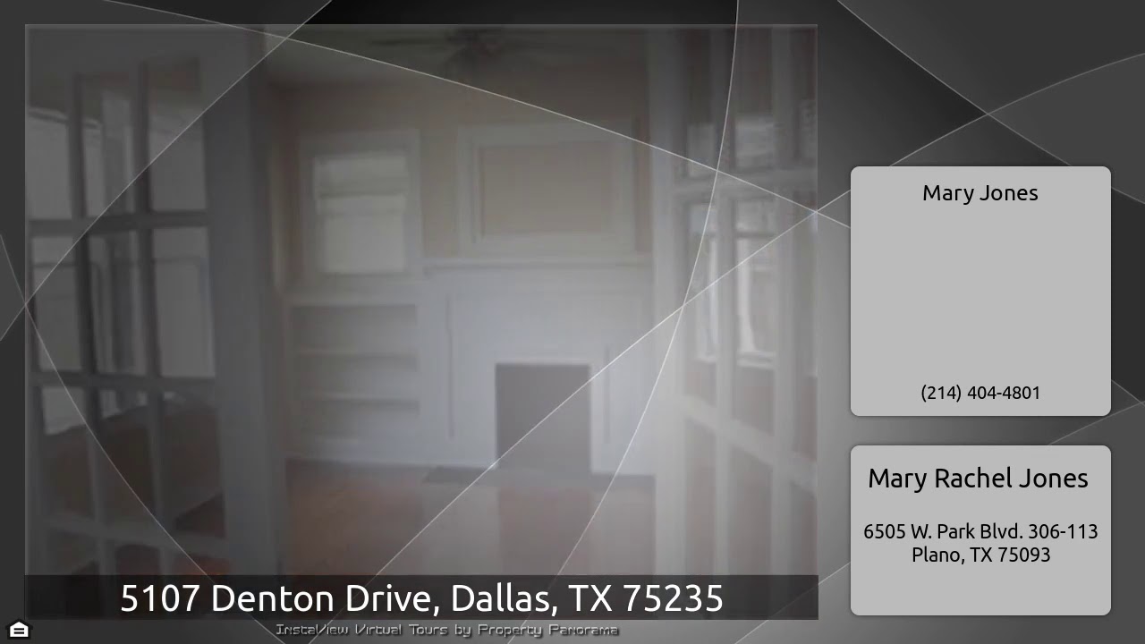 The Virtual Tour for the property at 5107 Denton Drive, Dallas, TX 75235 listed for $2,100: Other homes for sale by Mary Jones of Mary Rachel Jones: HUGE backyard. Hardwoods and Tile with fresh paint & ceiling fans throughout. Spacious open rooms with lots of natural light. Front bedroom could make a nice office. French doors from dining to living rm with built in bookshelves and decorative fireplace. Near 35@ Wycliff and North Dallas Tollway. Fridge, stove, dishwasher, washer&dryer. Tenant to verify all measurements and schools.