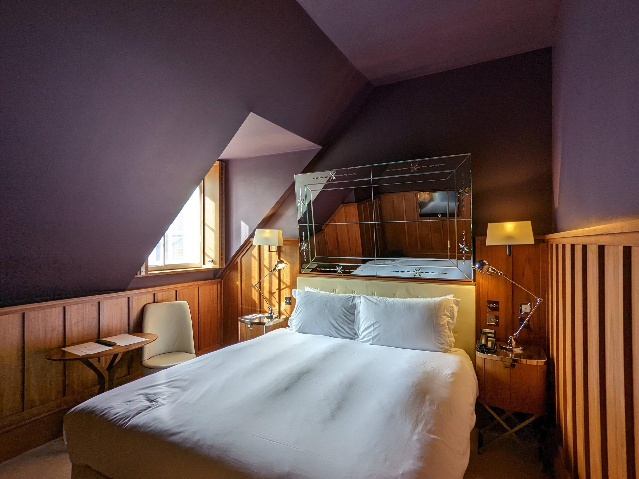 I love the colours and the window but…can you get to the one side of the bed without hitting your legs on the table and chair? Or past them at all? And it bothers me that the mirror isn’t flush with the wall