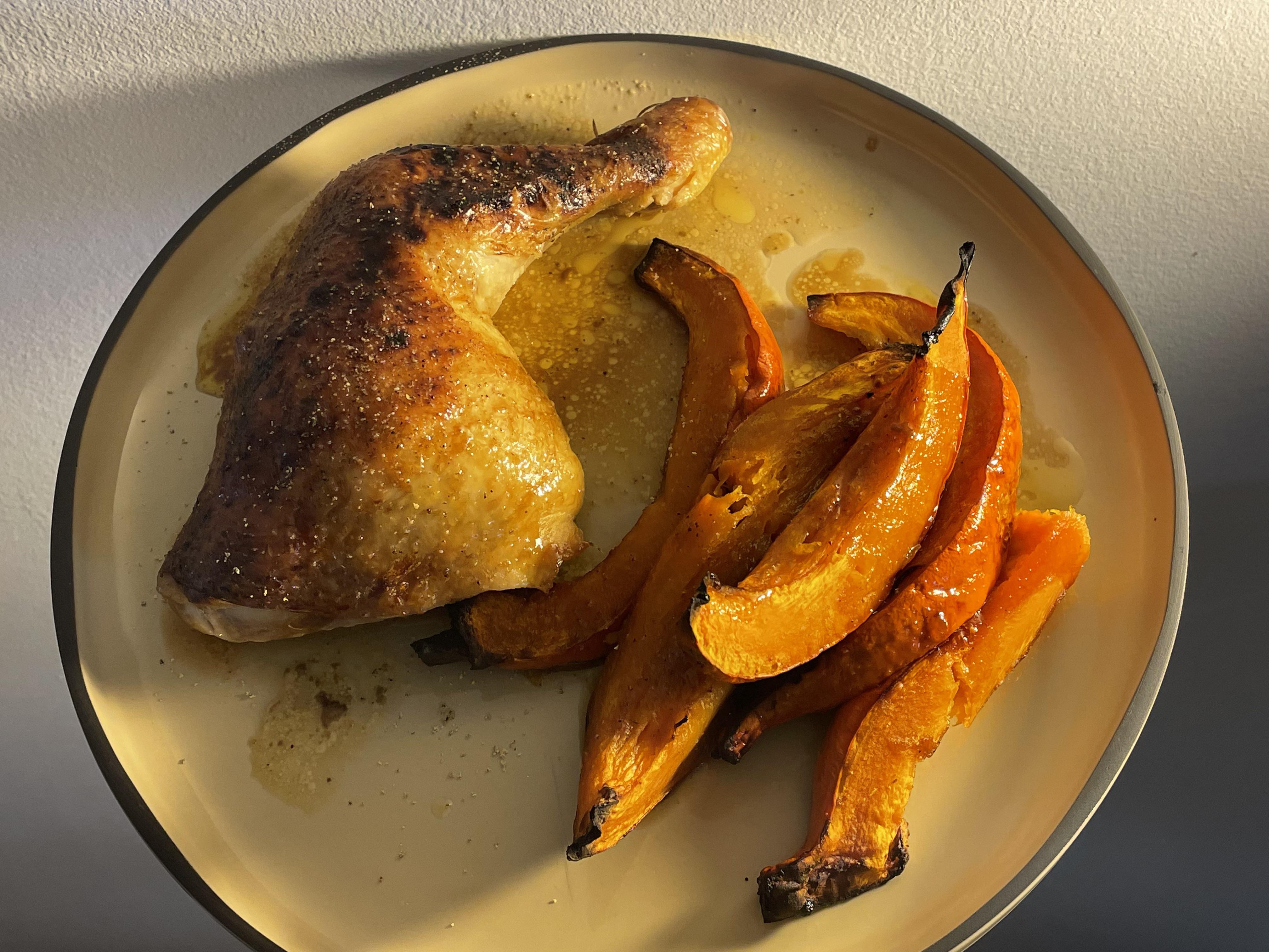 Badigeonner des quartiers de Potimaron ainsi que votre poulet avec une marinade à part égal de : *miel *huile d’olive *vinaigre (balsamique) Ici pour 2 personnes, 1CS de chaque à été utilisé.