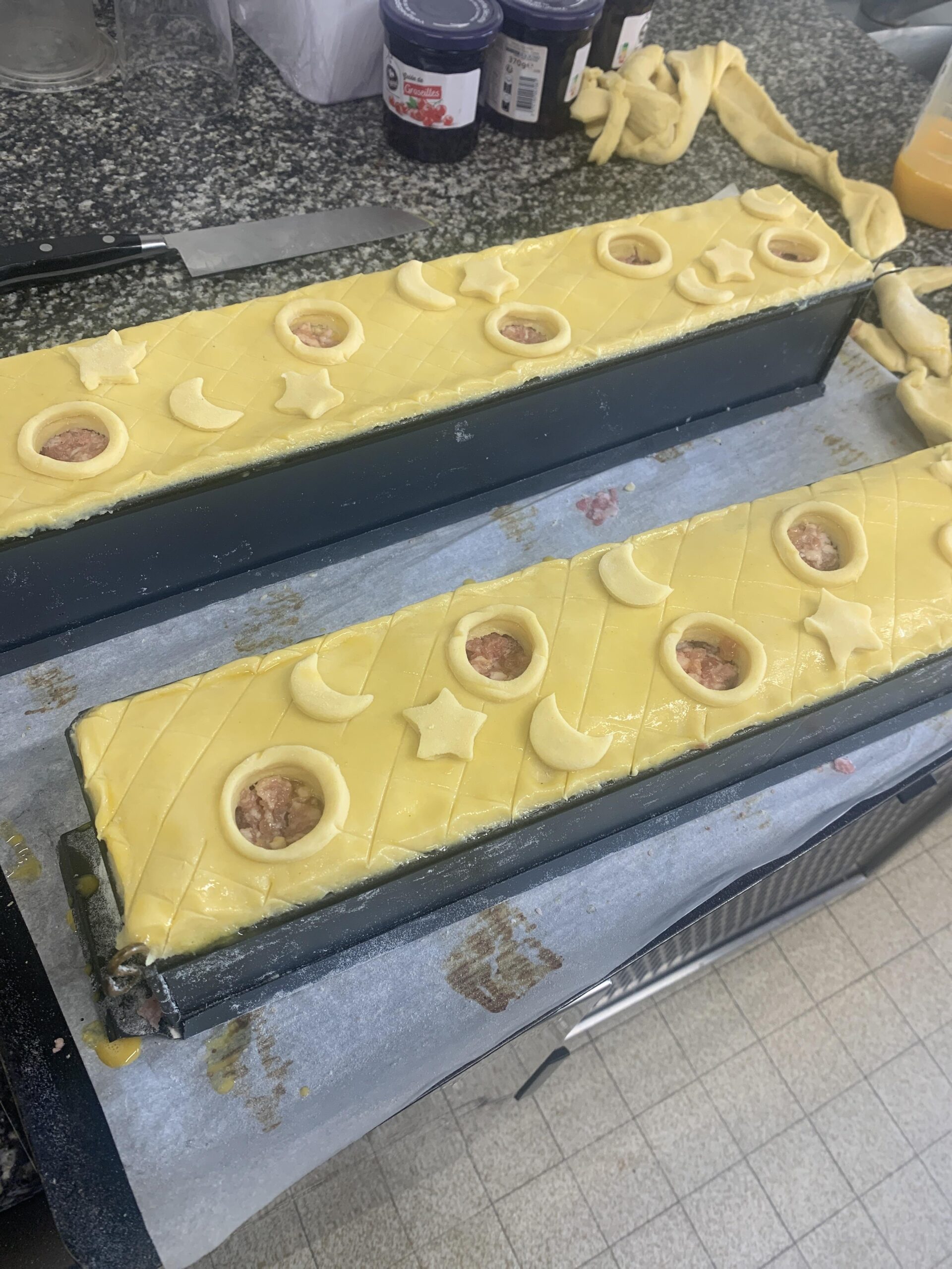 Une fois arrivé en haut vous collez le couvercle avec du jaune d’œuf à la pâte qui est sensé déborder de chaque côté du moule. Après par un geste de pression vous rentrez la pâte dans le moule puis vous coupez l’excédent (il y’a pas mal de vidéo YouTube je vous conseil d’en regarder un peu sinon c’est difficile à comprendre).