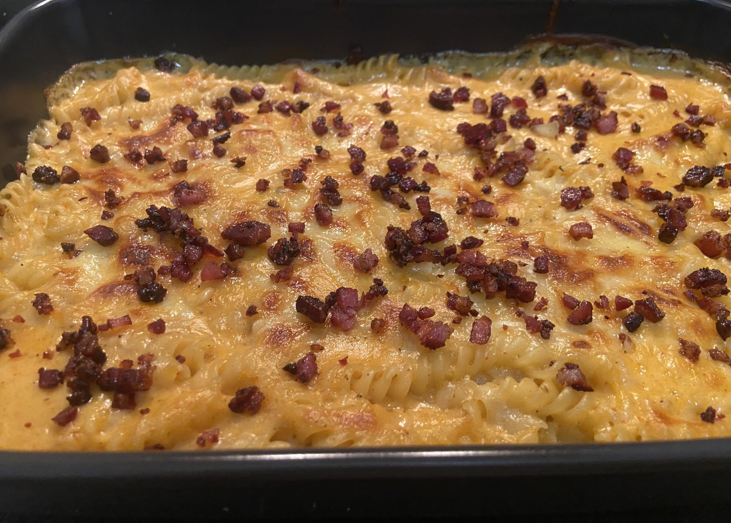 Faire cuire les pâtes – les enlever du feu 2-3 minutes avant le temps indiqué sur le paquet. Mélanger avec la sauce et parsemer de fromage râpé. Enfourner à 180 degrés pendant 10 minutes puis mettre sous le grill du four à 220 pour quelques minutes, jusqu’à ce que le fromage soit bien brunît. A la sortie du four, parsemer du lard croustillant coupé en petit morceaux.
