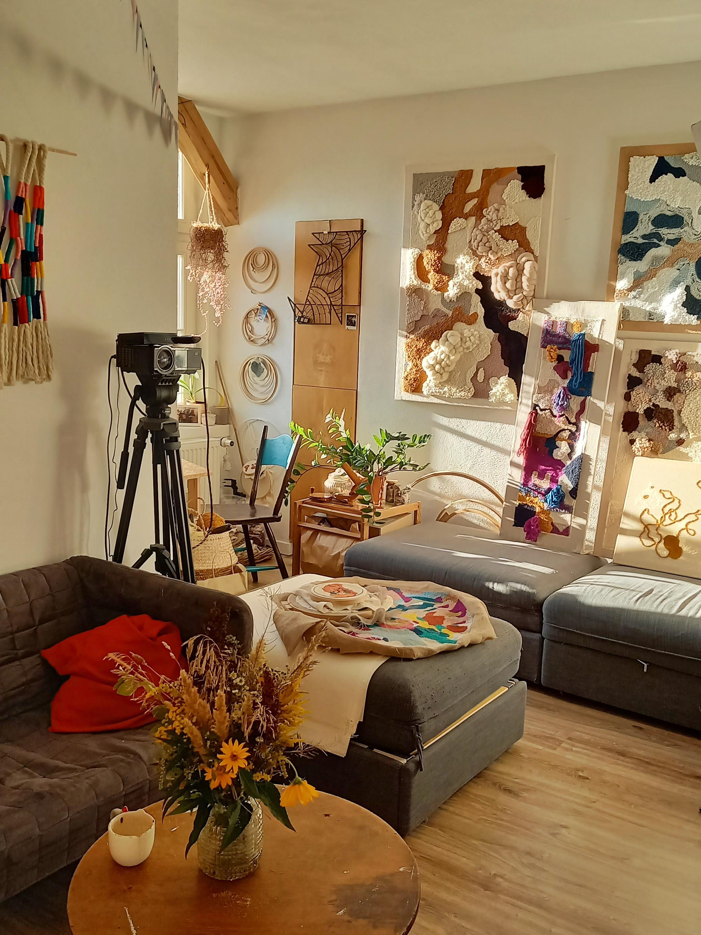 Wow your artwork (or the fiber art on the wall, maybe not yours) is INCREDIBLE!! I love it. Reminds me of an aerial view of a landscape with all the organic shapes and textures.