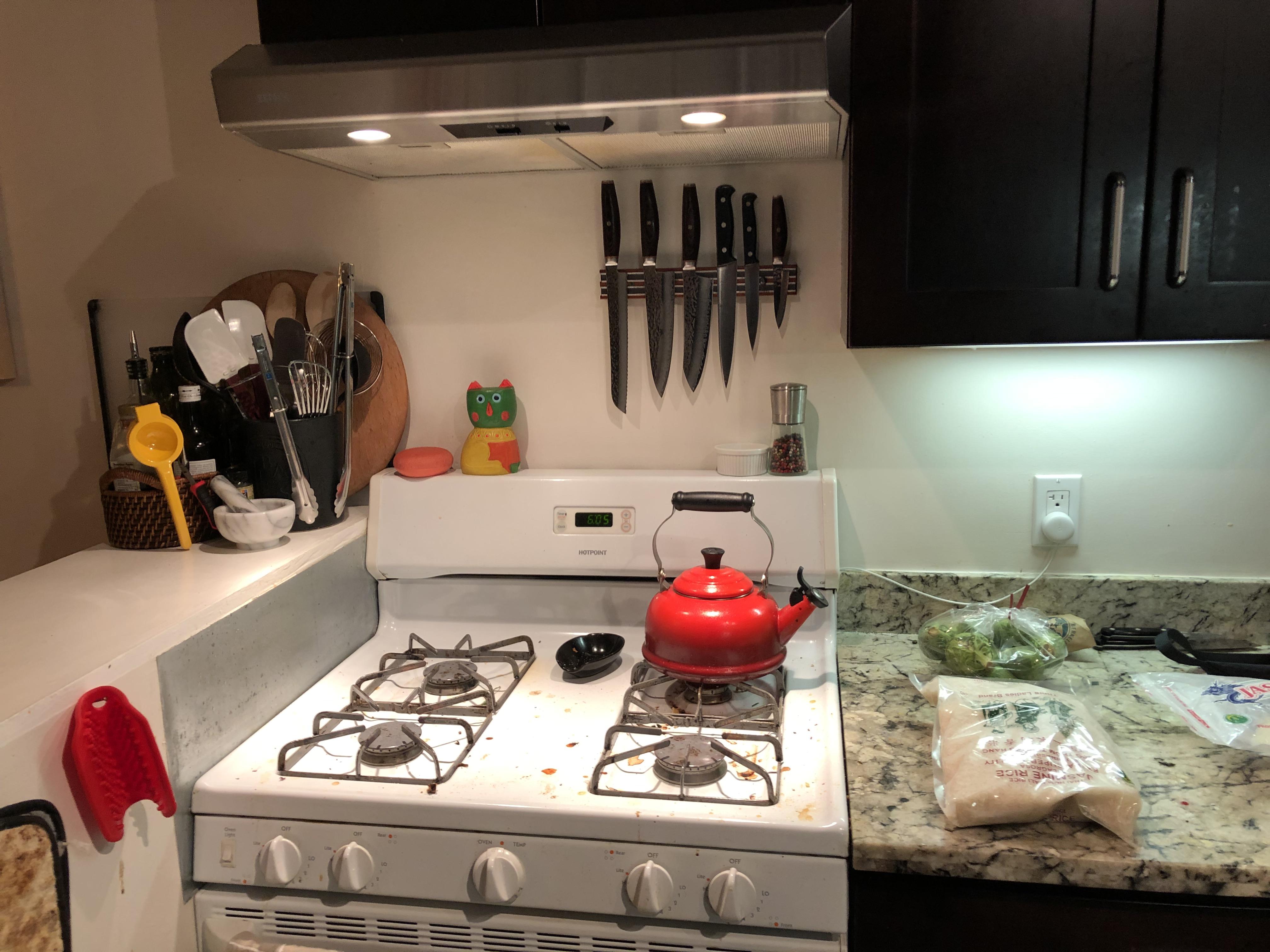 Behind the stove isn’t really where you need the knives, since you shouldn’t be using knives in pans on the stove. The stove also sends up clouds of grease. Also, in the future, if you’re going to post to a sub for kitchen porn, you might al least give the stove a wipe down first. Dirty kitchen always looks bad no matter how beautiful the appliance would be clean.