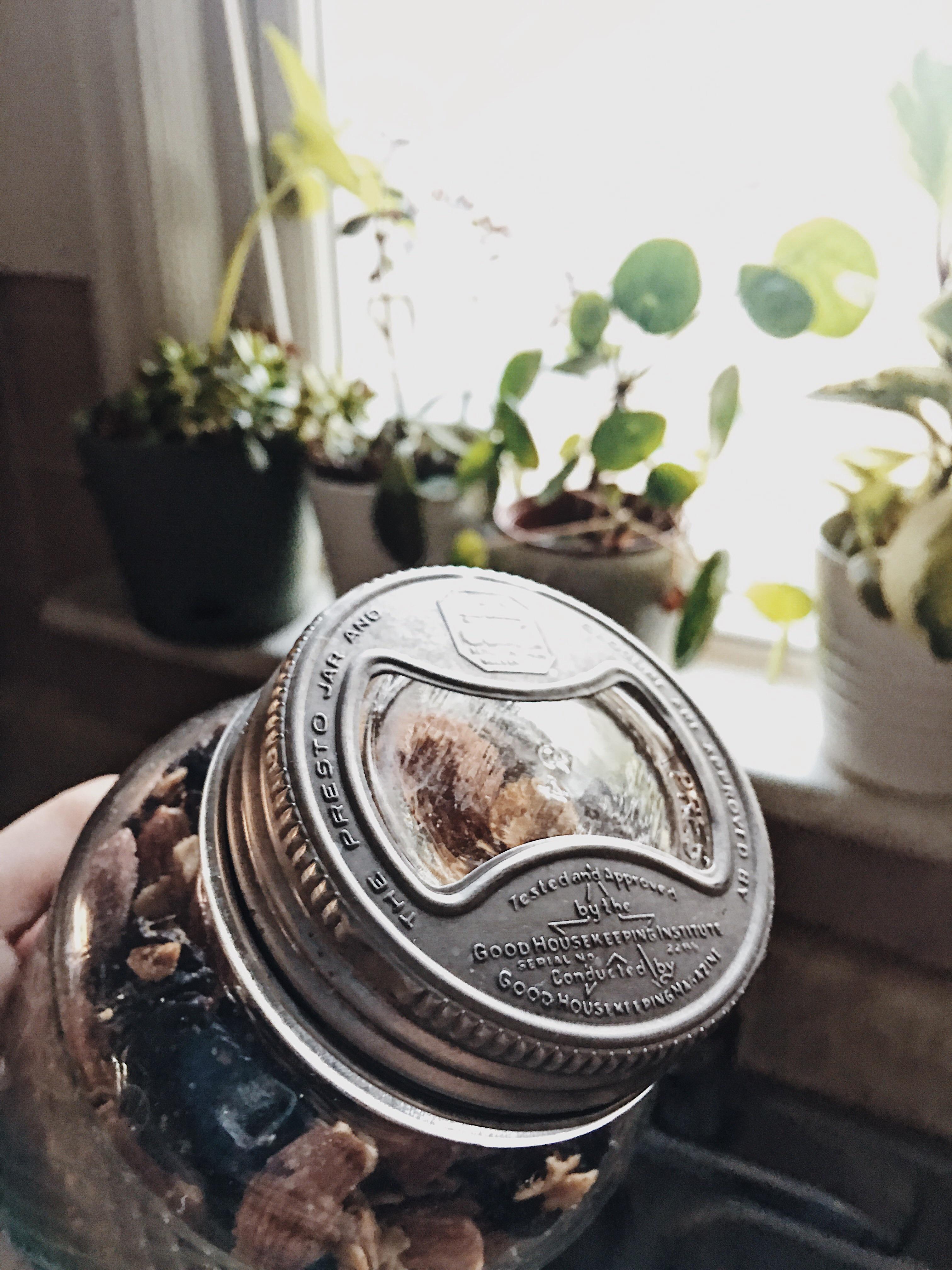 Once commented on how much I loved this old jar- my grandmother made homemade granola and gave it to me for Christmas. The smallest gifts with the biggest impact. Fun fact: the metal screws off to a thick bottle glass lid.