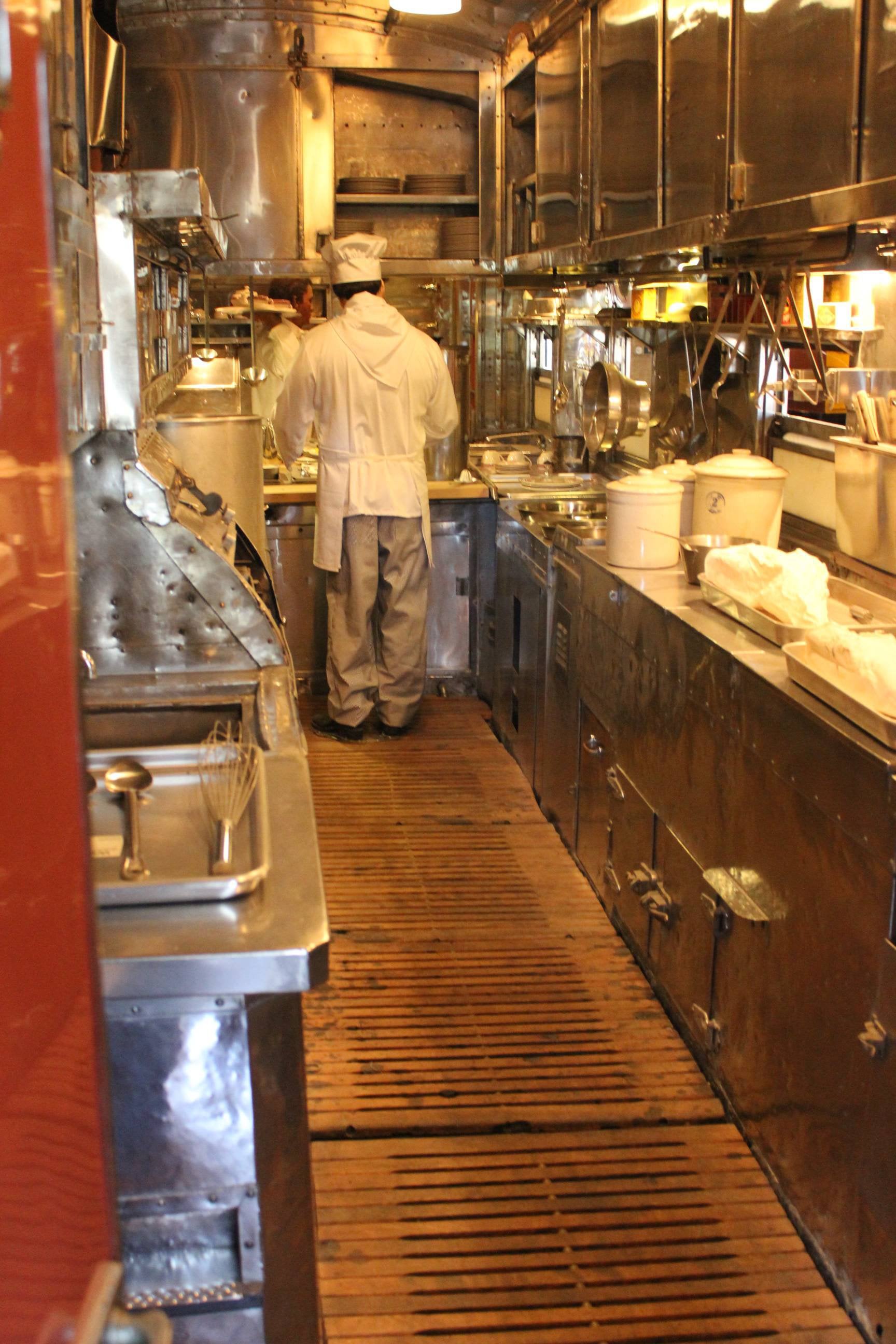 Is this the name of a kitchen shaped like this, is this a kitchen in a train, or is this a kitchen in restaurant named Train Kitchen?