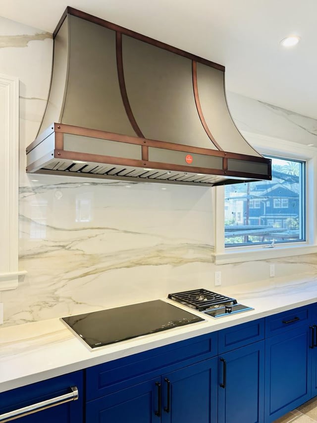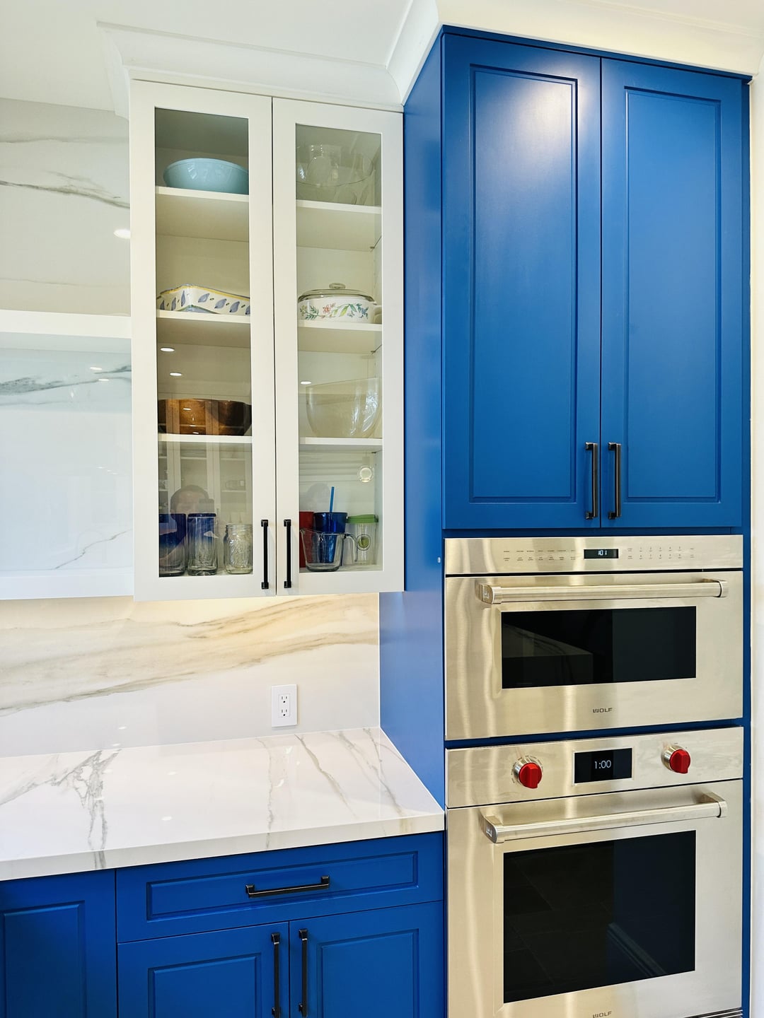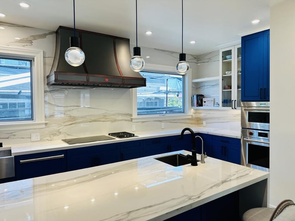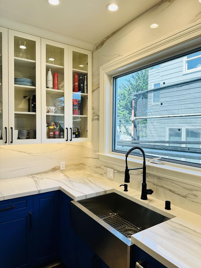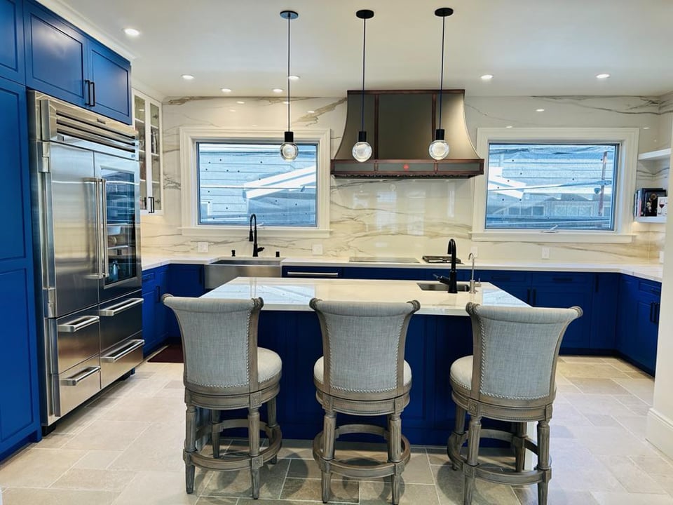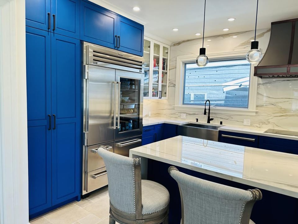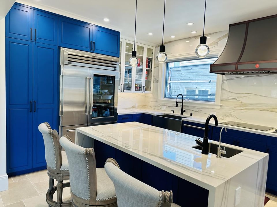Girl… that bright af blue 🤢 would give me a headache. The full heigh quartz backsplash is giving the room life tho.
