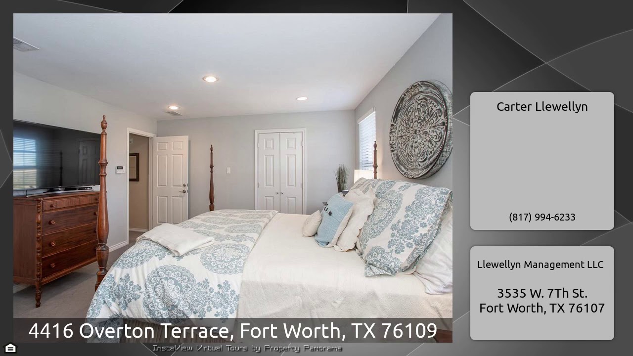 The Virtual Tour for the property at 4416 Overton Terrace, Fort Worth, TX 76109 listed for $649,000: Other homes for sale by Carter Llewellyn of Llewellyn Management LLC: Charming traditional two story home located toward the end of a quiet, tree-lined cul-de-sac. This home is a must see! Two living spaces, a wood burning fireplace, and a large formal dining room is just the beginning. The kitchen has a gas burning stove, an island, and room for a breakfast table. French doors in the kitchen lead to covered patio and fenced backyard. The large master bath boasts an oversized shower, soaking …
