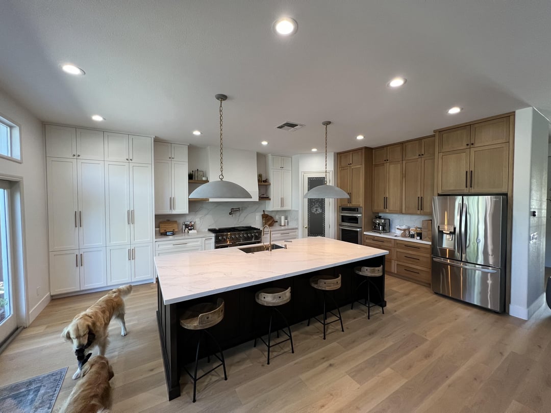 I’m planning a similar floor to ceiling panel.wall and large island. I like the r placement of all of your appliances and the hardware selection as well.