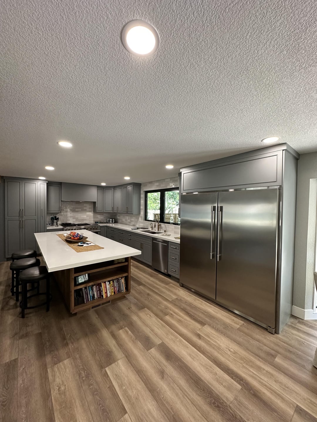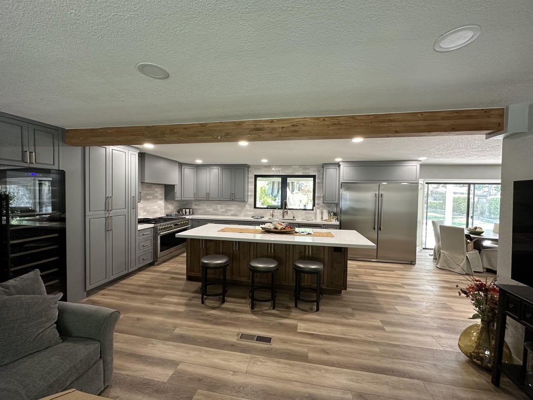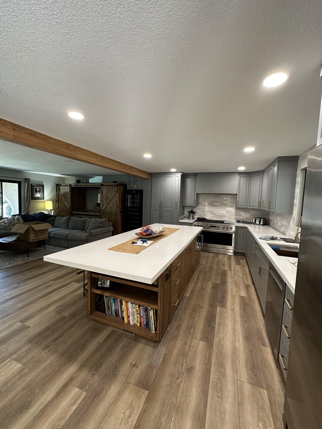 Nice looking kitchen. The lack of fillers on the wall cabinets to the right of the sink, left of the stove seem like a bit of an oversight though. The hardware is going to bang into end panels and prevent you from opening the door fully. Same thing with the fireplace.