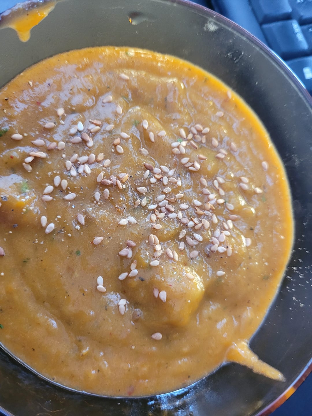 J’ai fait sué le tout avant, dans l’huile l’olive et du paprika, mouillé a hauteur, des petites herbes et un bouillon de cube végétarien, laissé mijoté 1h à feu doux, couvert, puis mixé