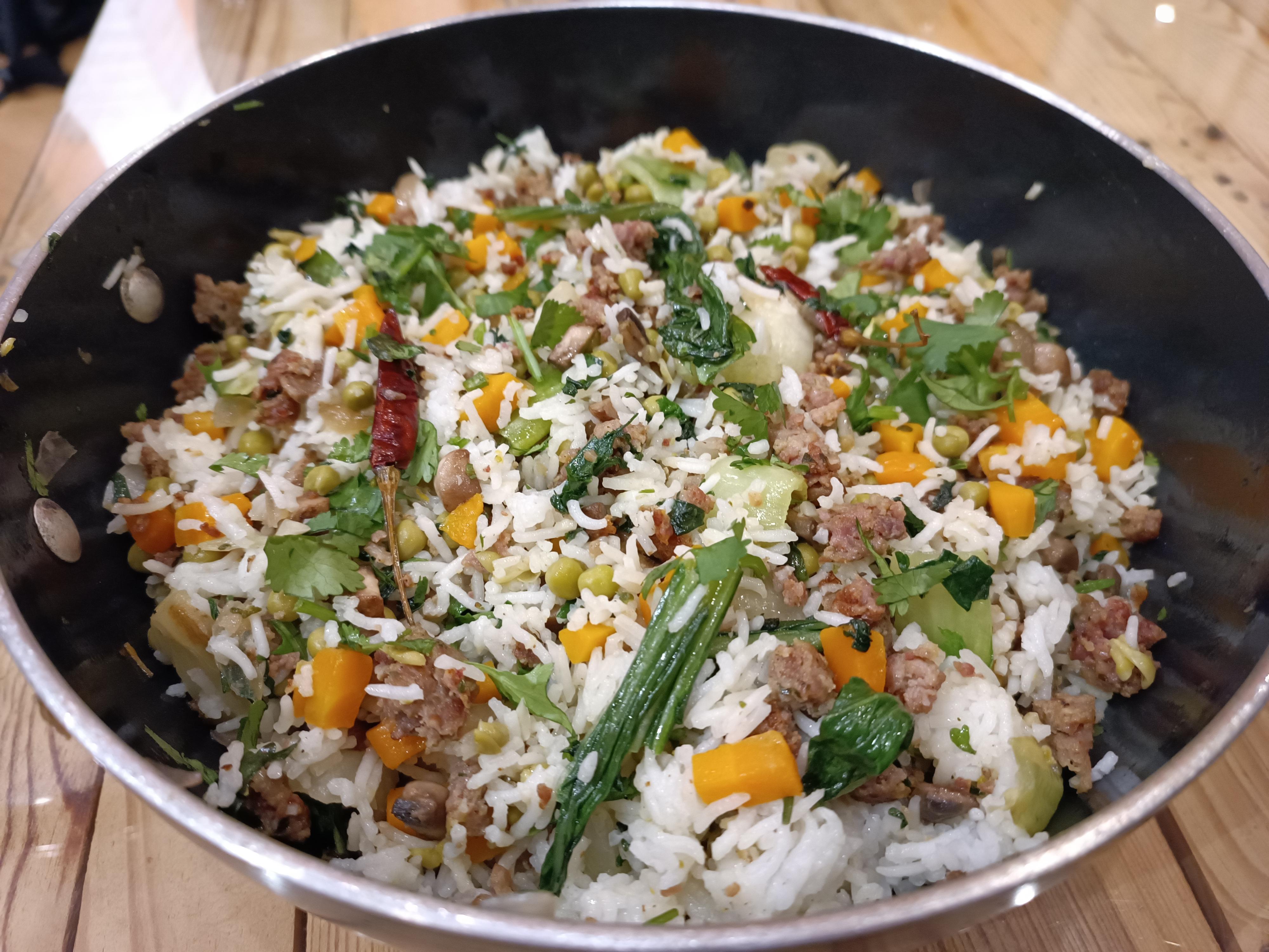 deyw75 4 years ago Ingrédients :– Carottes coupées en macédoine– Petits pois (surgelés)– Oignons rissolés– Pak choï sautés à la poêle– Chair à saucisse revenue vivement à la poêle pour que la viande soit colorée (à la limite du croustillant) + ail en fin de cuisson et coriandre– Coriandre– Sel + Poivre– Piment selon l’envie (ici piment rouge séché non dégoupillé)– Champignons de Paris (si vous trouvez des shiitakés c’est mieux) coupés en petits dés– évidemment ….. du rizMoi je cuis tout séparément (car les cuissons sont différentes et j’aime bien l’individualité des goûts) et assemblage à la fin.A déguster avec une sauce soja.