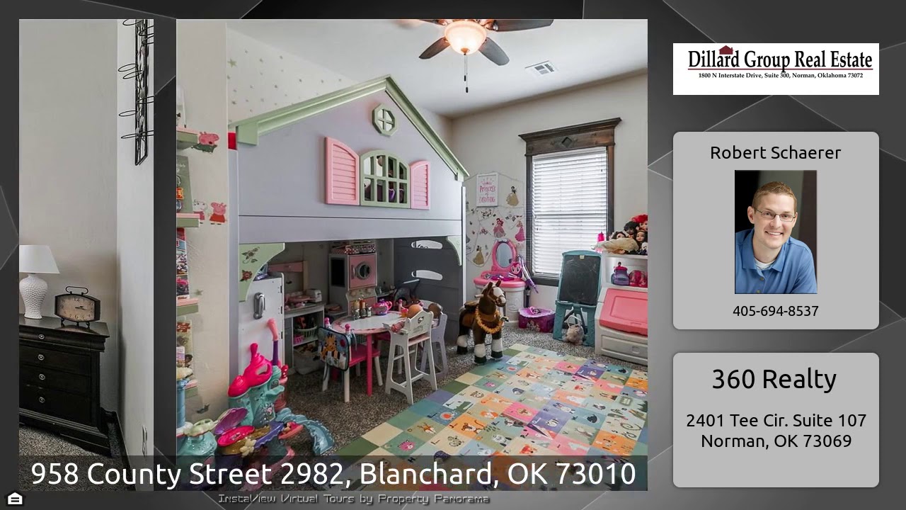 The Virtual Tour for the property at 958 County Street 2982, Blanchard, OK 73010 listed for $320,000: Other homes for sale by Robert Schaerer of 360 Realty: True 4 bedroom + Study in a shop friendly small acreage, close to I-44 but just far enough away! Cedar accents on the front of the house and beautifully landscaped! Big living room is partially open to the kitchen and dining area with wood floors in the living room! There are french doors going into the study with a built-in desk and a closet. Tons of space in the kitchen with a huge corner pantry, tons of cabinets (with under cabinet …