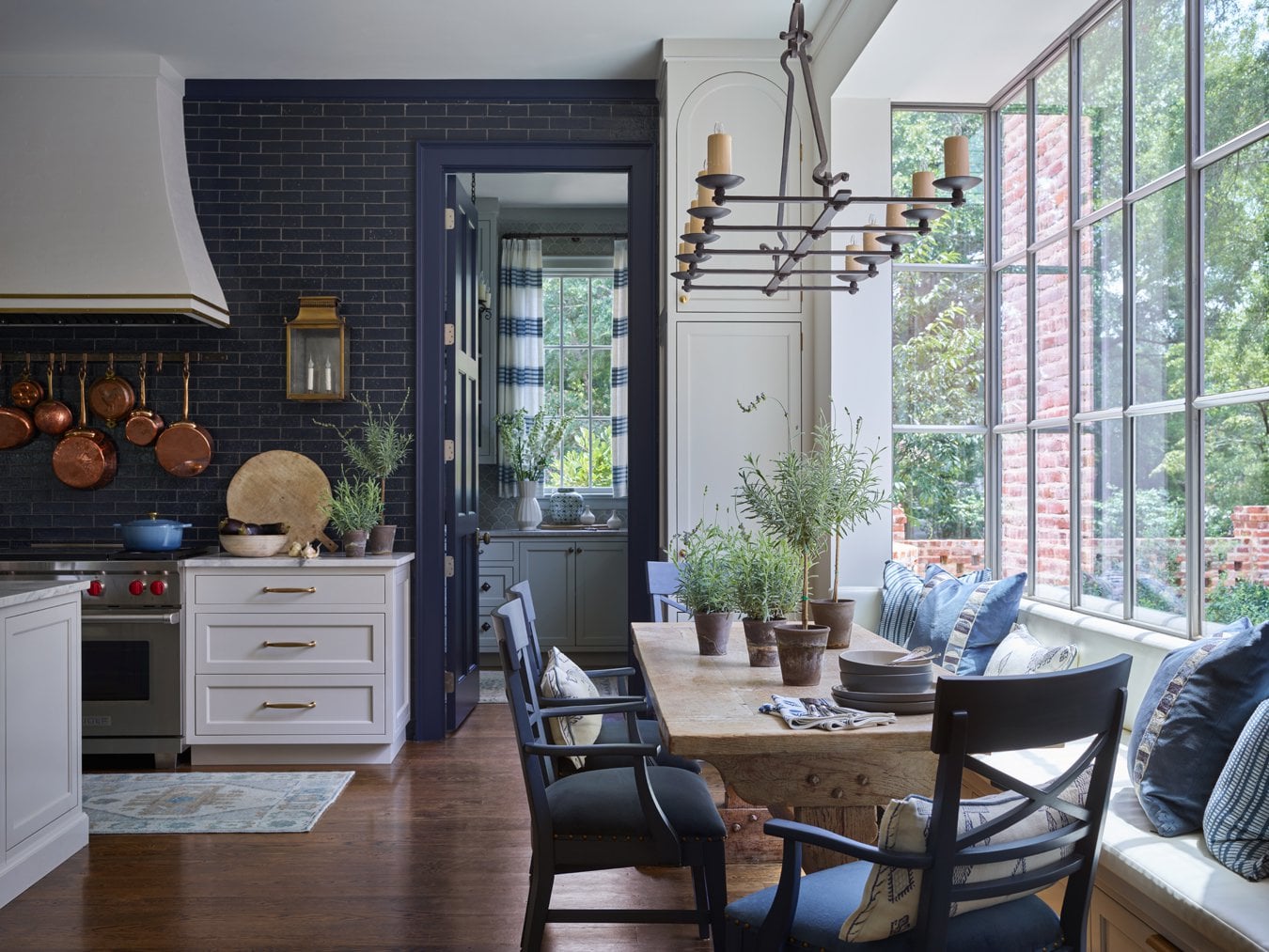 Never could understand this “hang pots and pans above the stove” thing… other than that, this is gorgeous. A little modern, a little farmhouse, balanced feminine-masculine vibe, cozy but bright and uncluttered.