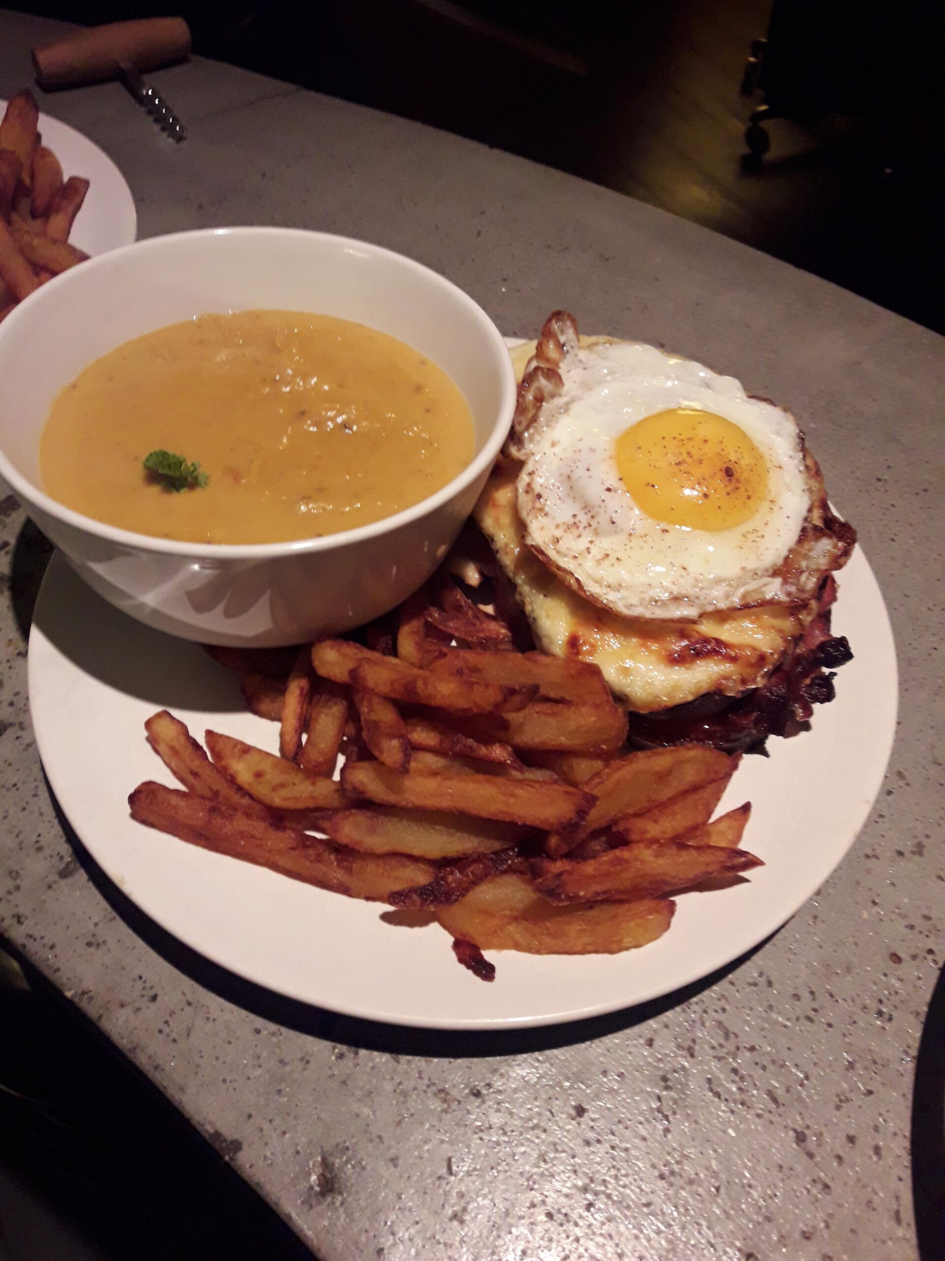 Croc Madame au comté, frites et velouté potiron/butternut au beurre et à la crème fraîche d’isigny