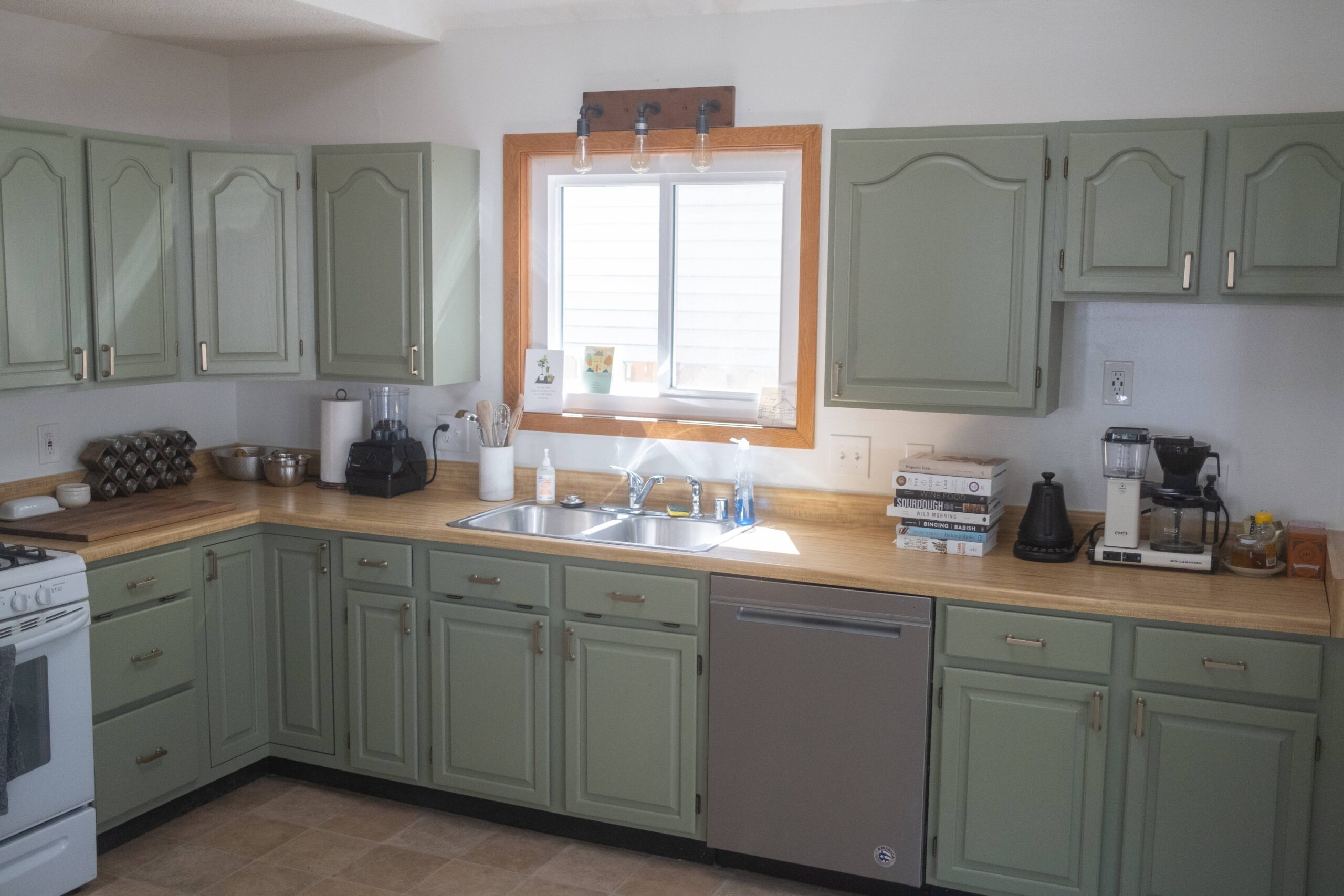 I agree with an above comment on painting the window trim white. As is or darker, it hides your new light fixture. White will help it stand out. I really like the green youโve selected for the cabinets. Very cozy. I also agree with another comment about a darker stain counter. Can some of the counter items get tucked away? Not the cabinets so thereโs real space between each item? Plants above the cabinets would be great. Something to close the visual space above the cabinets like windows panes and plant mix. Looks good, OP!