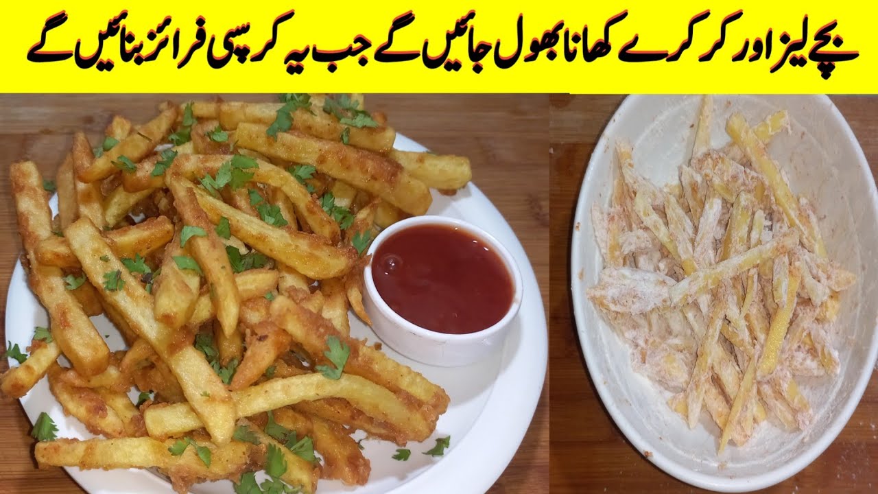 ye hai meri aj ki crispy French Fries ki Recipe Umeed hy apko pasand ayegi___________________________________ —————————————————————————————- Crispy French Fries Written Recipe With Directions: Ingredients – Aloo (potato) peeled 1kg Big size -Corn flour 2 tbs –All-purpose flour (maida) 1 tbs -Oil for frying -Red chilli flakes (koti lal mirch) to taste (optional) -Salt (namak) to taste (optional) -Chat masala to taste (optional) Directions: -Wash, peel, and cut potatoes vertically into pieces. You can also use a curly fries cutter (optional). -In a separate bowl, add water and potatoes. Let it rest for a few minutes, then strain. -In a pan, add water and bring it to a boil. -Now, add potatoes and cook them for 3 minutes. Stir the spoon continuously. -After 3 minutes, strain the fries and let them cool. -Remove all the water from the fries with the help of a kitchen towel by pressing it gently. -After that, in a strainer, add fries, corn flour, and all-purpose flour and coat well, then shake well to remove excess flour. -In a deep-frying pan, heat the oil, and add fries on high flame. Fry the fries for 8 minutes, then takeout and let them cool (at this point, you can also freeze them). Repeat the frying process and fry it for 3 minutes on high flame. -Bring out the fries. Sprinkle red chilli flakes, salt, and chat masala and mix well. -Serve the crispy Fries with ketchup and enjoy. Tips and Tricks: -To make the fries crispy, do not coat the cornflour and all-purpose flour on hot-boiled fries. Always coat them after cooling. ———————————————————————————————— About This Video: In This Video I Am Going To Share With You Crispy French Fries Recipe. I Tried My Best To Explain The Recipe Of Potato Fries Step By Step. I Hope You Will Like This Recipe Very Much. Musarat FoodSecrets. Chef Musarat. ___________________________________ French Fries Recipe | How To Make Crispy French Fries At Home | BaBa Food RRC | Chef Rizwan | Fries Recipe | Aloo Ki Chips | KFC Style Crispy Fries Recipe | Chips Recipe | How To Make Crispy French Fries | Crispy French Fries | French Fries | Musarat Food Secrets Recipes | Potato Snacks Recipe | Potato Chips Recipe | How To Make French Fries at Home | Easy French Fries | How To Make KFC Fries At Home | BaBa Food RRC | French Fries Recipe | Chef Musarat | ___________________________________ Snacks Recipe | Potato Recipe Quick Snacks Recipe | 3 ingredients Snacks | Evening Snacks Recipe | Instant Snacks Recipe | Tea Time Snacks Recipe | Easy Snacks Recipe | Quick Snacks | Healthy Snacks Recipe | Kids Snacks | Quick Tea Time Snacks Recipes | Snacks Recipes | Easy Snacks | Instant Snacks | Quick Snacks | Instant Veg Snacks Recipes | Homemade Snacks | Indian Snacks For Kids | Healthy Evening Snacks Indian | Evening Snacks Indian | #FrenchFries #crispyfrenchfries #frenchfries #Fries #potatosnacks #potatorecipe #chipsrecipe #kfc_style _crispy_fries #aloochips #musaratfoodsecrets #musaratfood_Kitchen#musaratfoodrecipes #Chef-musarat #Chef_Musarat