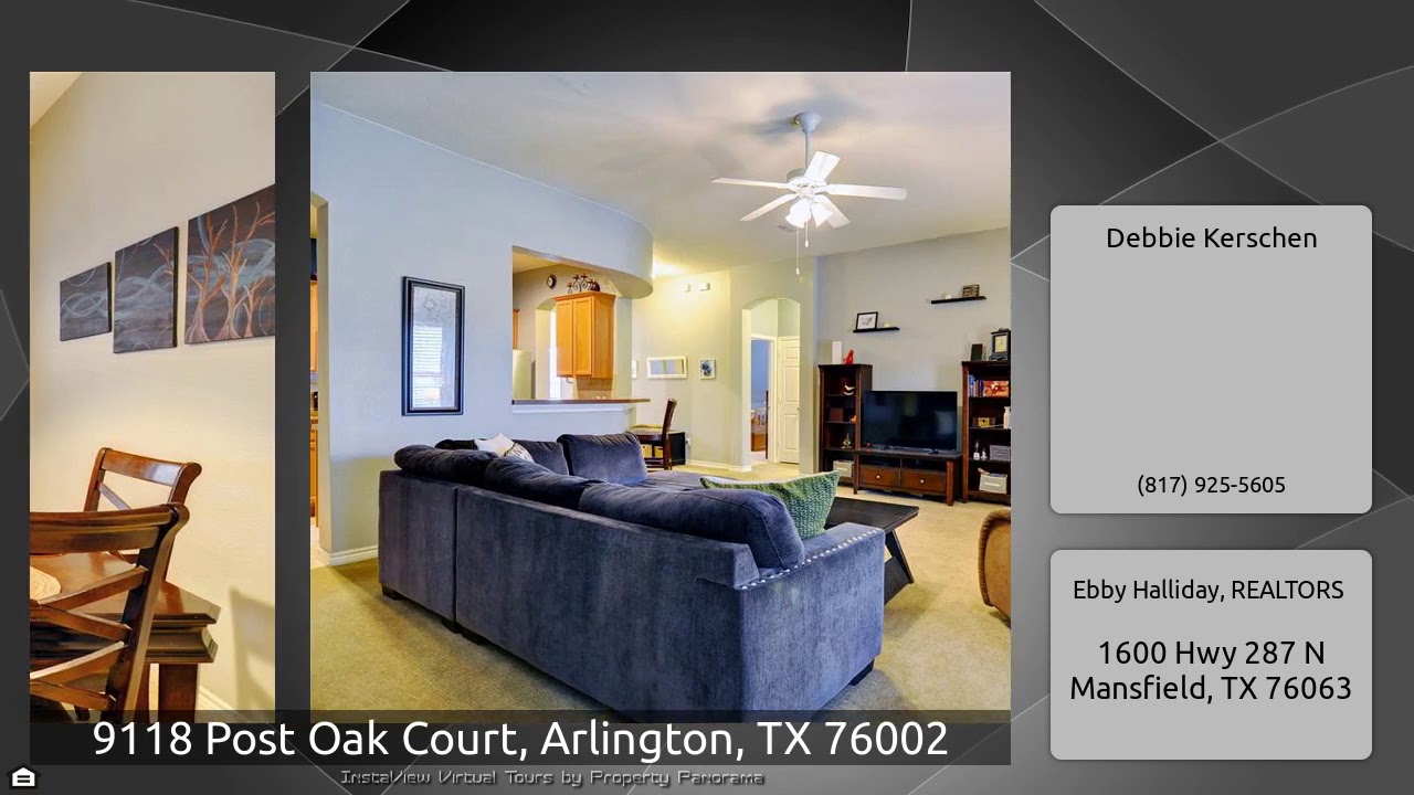 The Virtual Tour for the property at 9118 Post Oak Court, Arlington, TX 76002 listed for $267,500: Other homes for sale by Debbie Kerschen of Ebby Halliday, REALTORS: This beautifully maintained home is located in the desirable Mansfield ISD with a community pool on a long cul de sac street. Off the entry is a study with glass french doors and large windows for natural light. The formal dining is currently being used as a living area. The kitchen is centrally located with an eat in kitchen that has access to a smaller side patio. The breakfast bar opens to the large family room that has …
