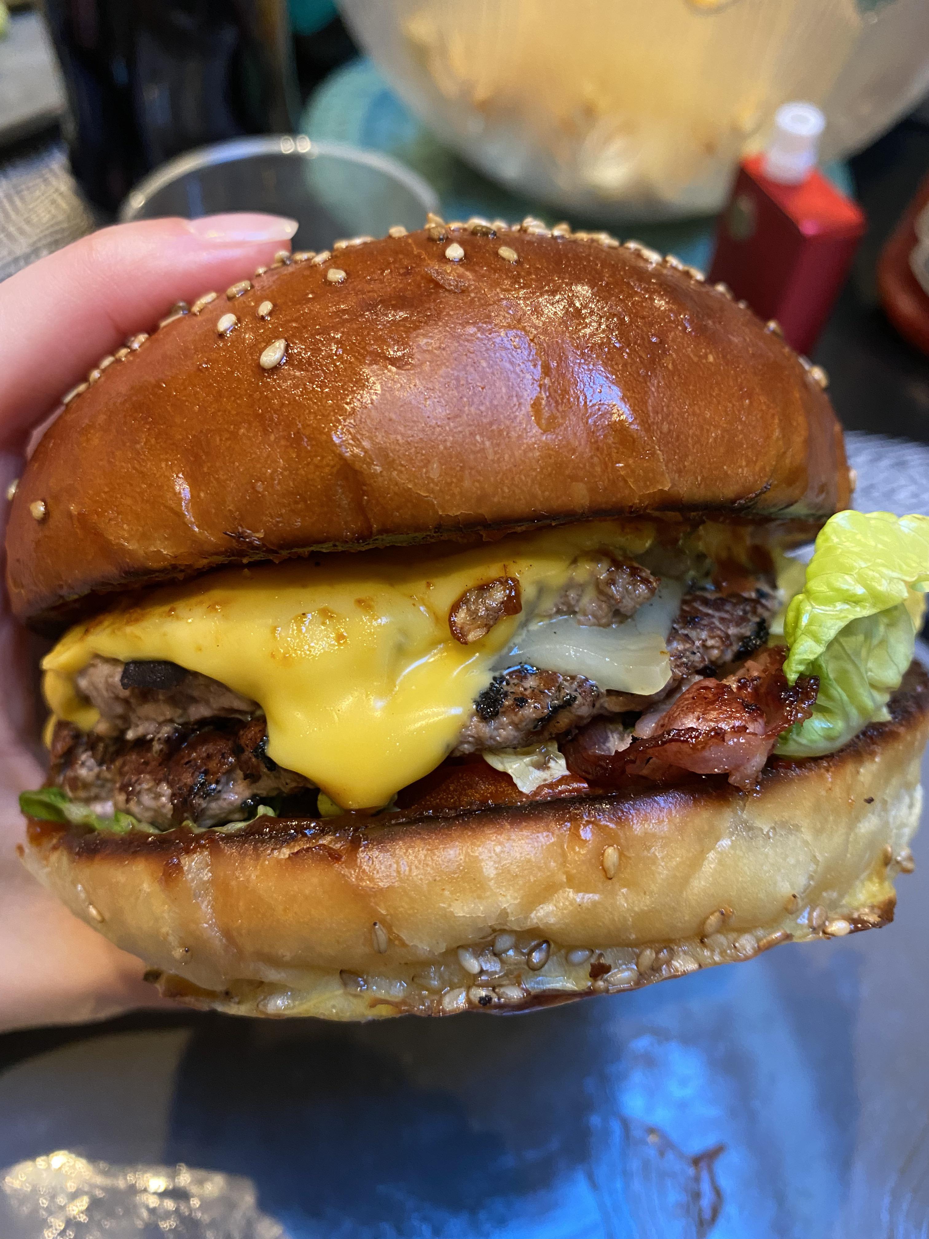 A l’intérieur : – viande bouchère (steaks double) – salade – lard fumé du boucher – tranche de cheddar et comté – sauce barbecue épicée / fumée maison – tomate (option selon les invités) – oignon (option aussi) Edith : J’ai oublié le pickles maison !