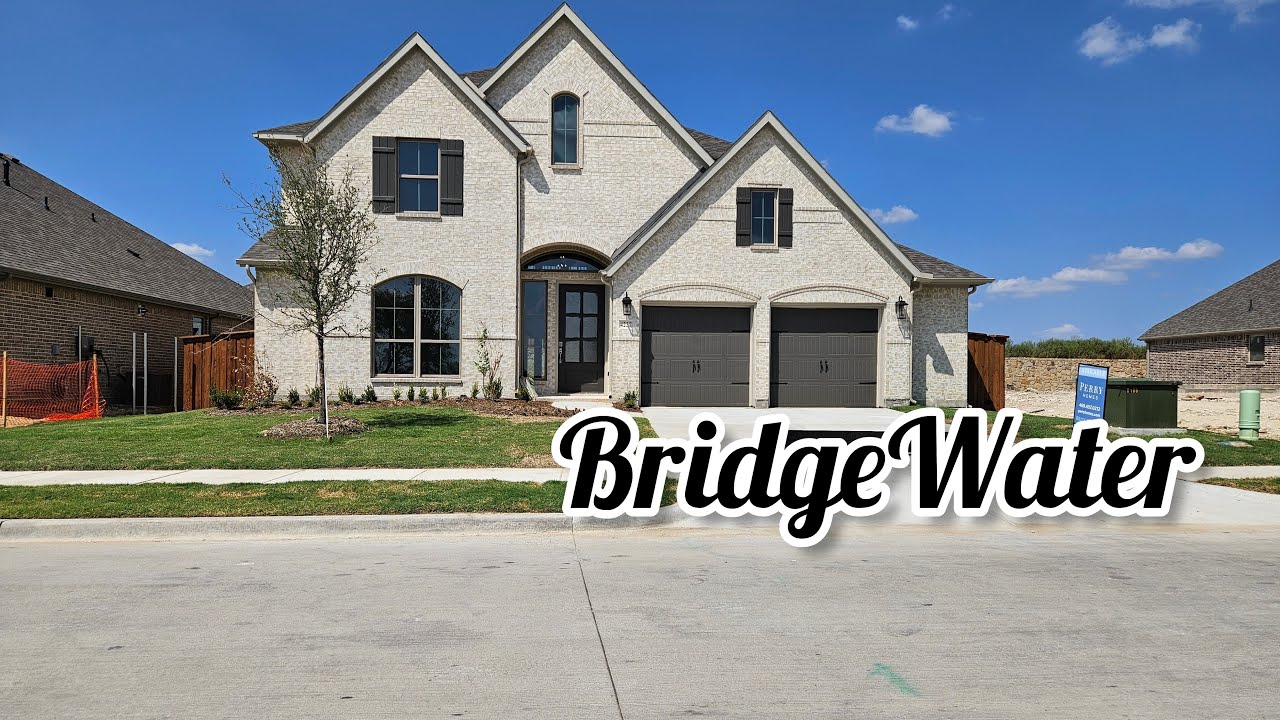 Home office with French doors set at two-story entry. Formal dining room across from staircase. Two-story family room opens to kitchen and morning area. Family room features wood mantel fireplace and wall of windows. Kitchen features deep walk-in pantry, Butler’s pantry, 5-burner gas cooktop, and large island with built-in seating space. First-floor primary suite includes bedroom with curved wall of windows. Double doors lead to primary bath with dual vanities, garden tub, separate glass-enclosed shower, and two walk-in closets. An additional bedroom is downstairs. A game room and secondary bedrooms are upstairs. Extended covered backyard patio. Mud room off three-car garage.