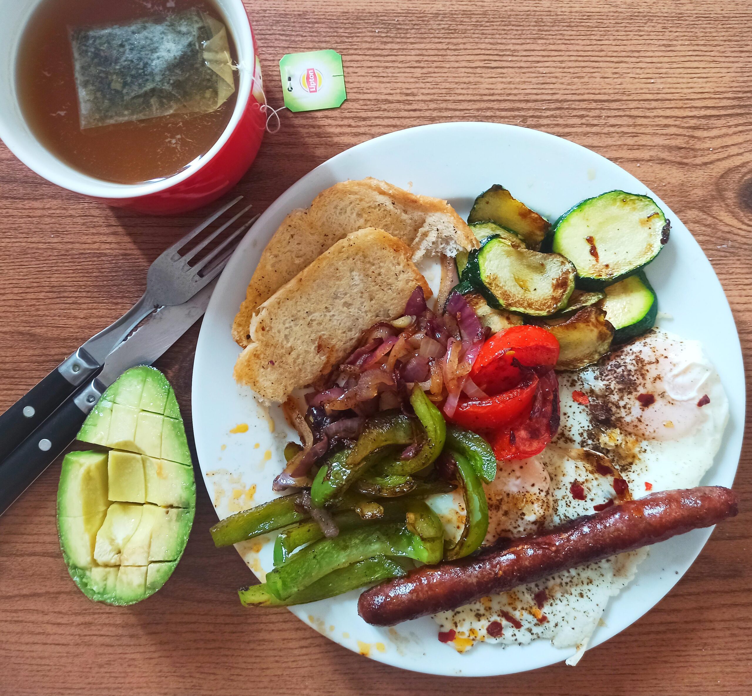 smolboson 4 years ago On a :Protéines: 2 oeufs et 1 merguez. Légumes : courgette, onions, tomates, poivron, avocat. Puis une tranche de pain et un thé 🙂