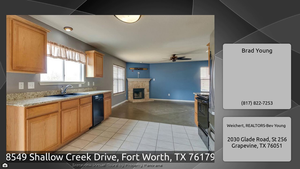 The Virtual Tour for the property at 8549 Shallow Creek Drive, Fort Worth, TX 76179 listed for $210,000: Other homes for sale by Brad Young of Weichert, REALTORS-Bev Young: Attractive, Spacious and Affordable with a Back Yard Designed for Entertaining! Desirable Corner Lot with Wooded View and No Homes Behind It Offers Extra Parking on Dead-End Street. Spacious Family Room Accented by Beautiful Stone Fireplace, Huge Game Room Wired for Theater Sound and Generously-Sized Study with French Doors. Open Kitchen Features Granite Countertops, Ceramic-Tile Flooring and Sizable Dining Area. …