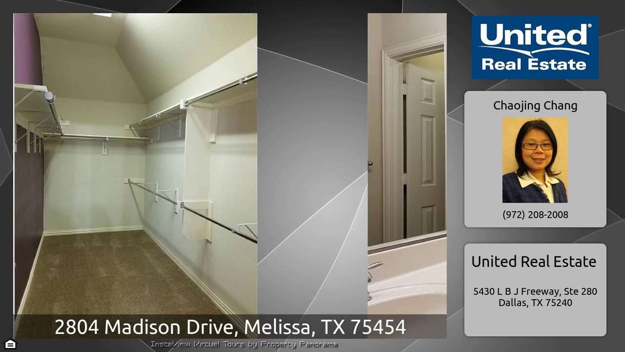 The Virtual Tour for the property at 2804 Madison Drive, Melissa, TX 75454 listed for $1,900: Other homes for sale by Chaojing Chang of United Real Estate: Beautiful and spacious Highland home located on a private cul-de-sac, in Liberty community of Melissa. Home has 4 bedrooms plus a private office with french doors. Large kitchen with tons of cabinets and counter space opens to the living and breakfast room. Family room has a floor to ceiling flagstone fireplace and wall of windows overlooking the over sized backyard. Split bedrooms. Formal dining. New luxury vinyl floor in living and …