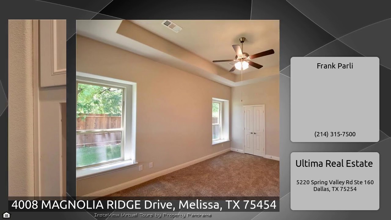 The Virtual Tour for the property at 4008 MAGNOLIA RIDGE Drive, Melissa, TX 75454 listed for $309,990: Other homes for sale by Frank Parli of Ultima Real Estate: BRAND NEW ONE STORY IN MAGNOLIA RIDGE MELISSA! Fantastic floor plan- Large Family room, great kitchen featuring Custom Cabinets, Granite countertops, walk-in pantry, and breakfast bar. Study with French Doors, Formal Dining Room, Large private Master Bedroom with no common walls with rest of home, and 3 large bedrooms! Ready NOW.