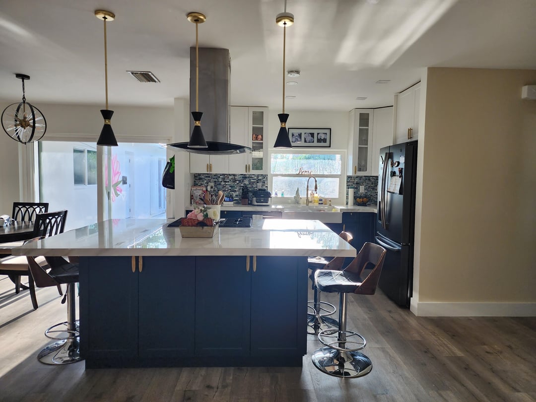 Beautiful! Love the stools, very unique. It’s hard to put a vent above the island without it blocking your sight but it works in this space.