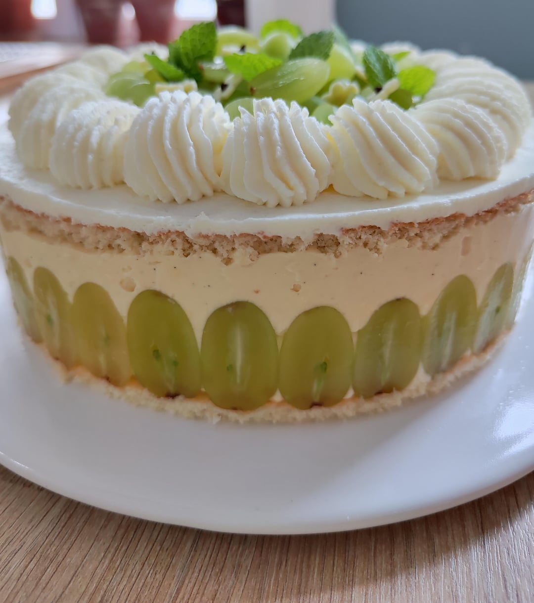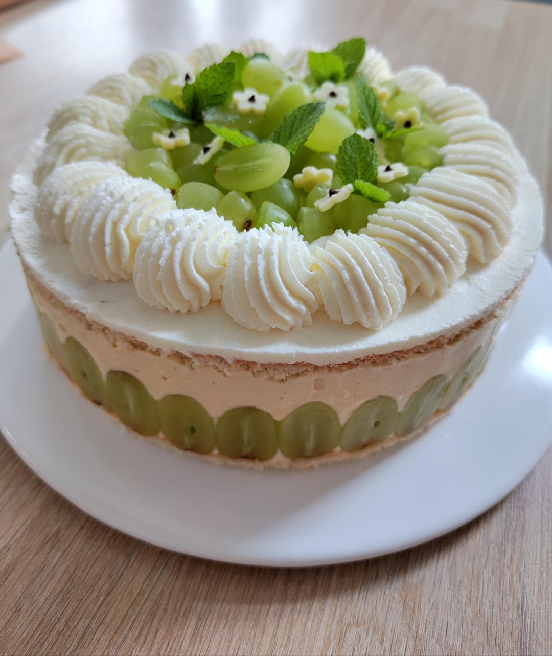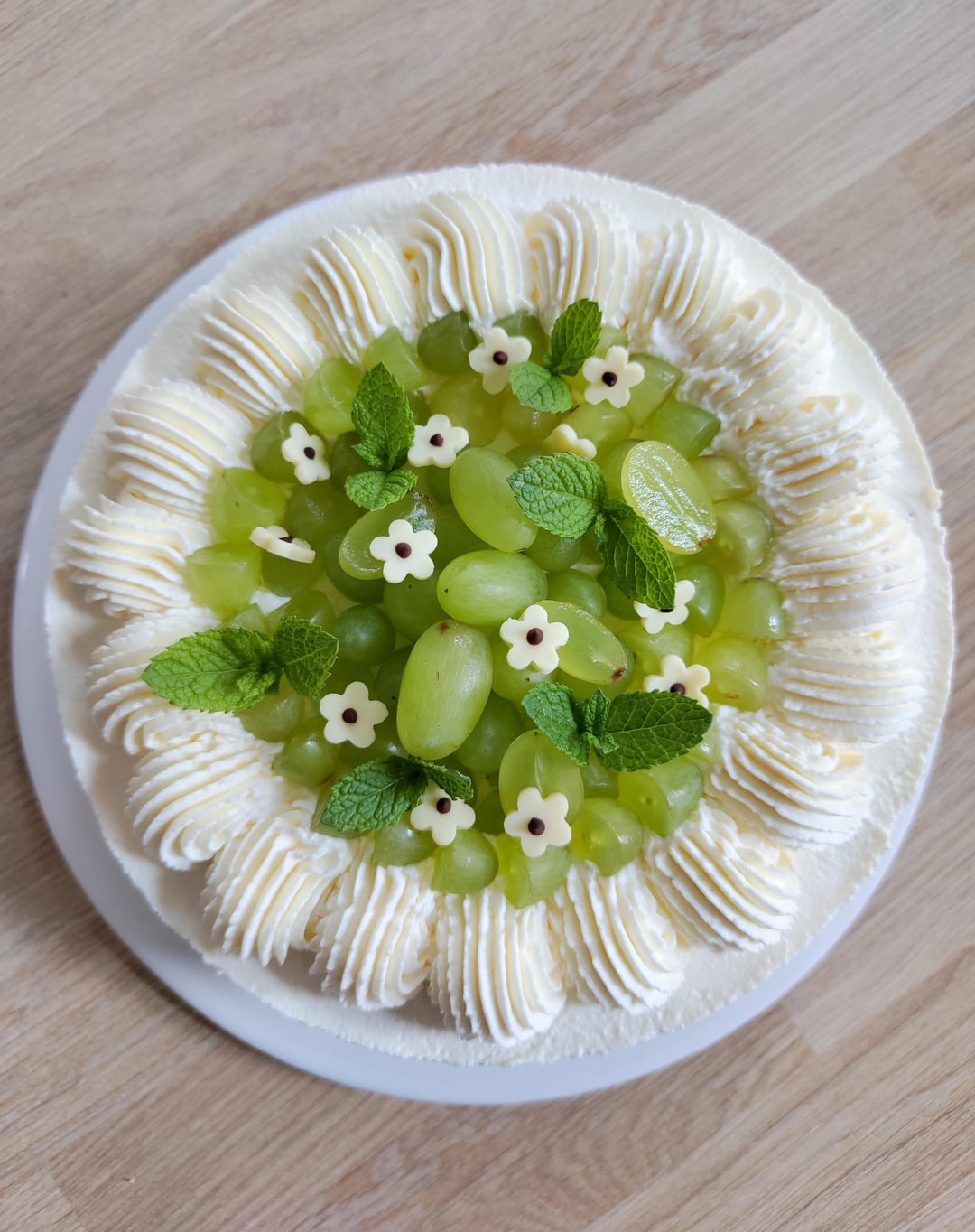 Magnifique ! Étrange comme idée, je n’y aurais jamais pensé car je n’aime pas particulièrement le raisin et c’est un fruit plutôt rare en pâtisserie mais très original et très beau visuellement. À essayer avec d’autres fruits (poire, pêche, banane…). Félicitations !