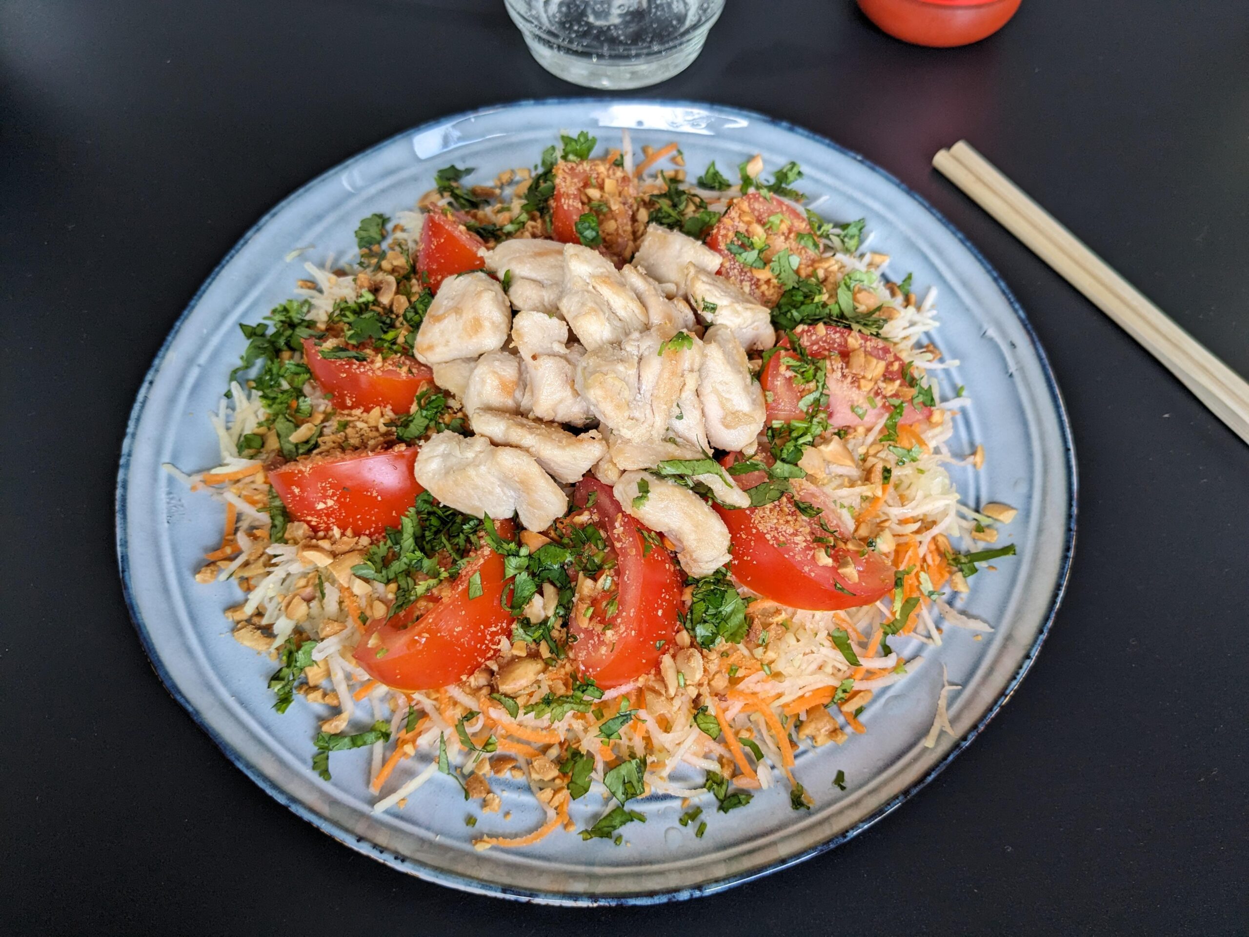 Papaye verte (d’Espagne) et carottes râpées, tomates, coriandre, cacahuètes torréfiée maison, poulet frit dans de l’huile de coco et sauce nuoc mam/ail/citron vert. Piment de cayenne ou sauce Sriracha en option pour ceux (comme moi) qui aiment quand ça arrache. Simple, frais, healthy, rapide, excellent. J’adore cette salade !