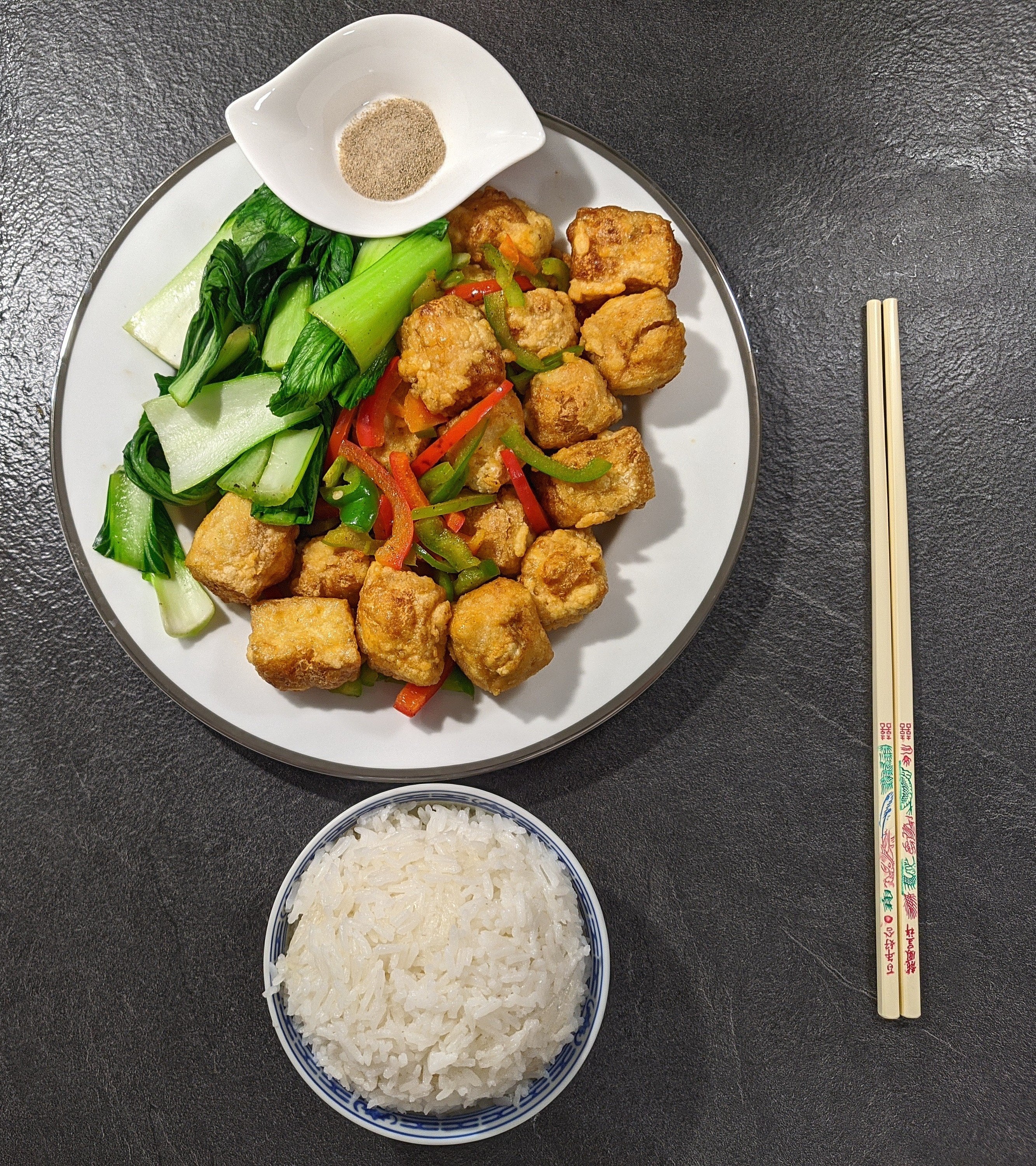**Étapes Principales :** Bouillir les cubes de tofu pendant 2min dans l’eau bouillante Couper les poivrons pendant ce temps Rincer à l’eau froide et égoutter (tamponner avec du papier absorbant). Il faut enlever le plus d’eau possible pour éviter que ça éclabousse de partout lors de la friture lorsque l’eau entrera en contact avec l’huile. Un récipient avec deux œufs battus, un autre récipient avec de la maïzena. Plonger le tofu dans l’œuf puis dans maïzena. Chauffer de l’huile à 180° Frire le tofu en plusieurs batch. Obtenir une couleur dorée. Réserver. Faire sauter les poivrons. Rajouter le tofu. Servir.