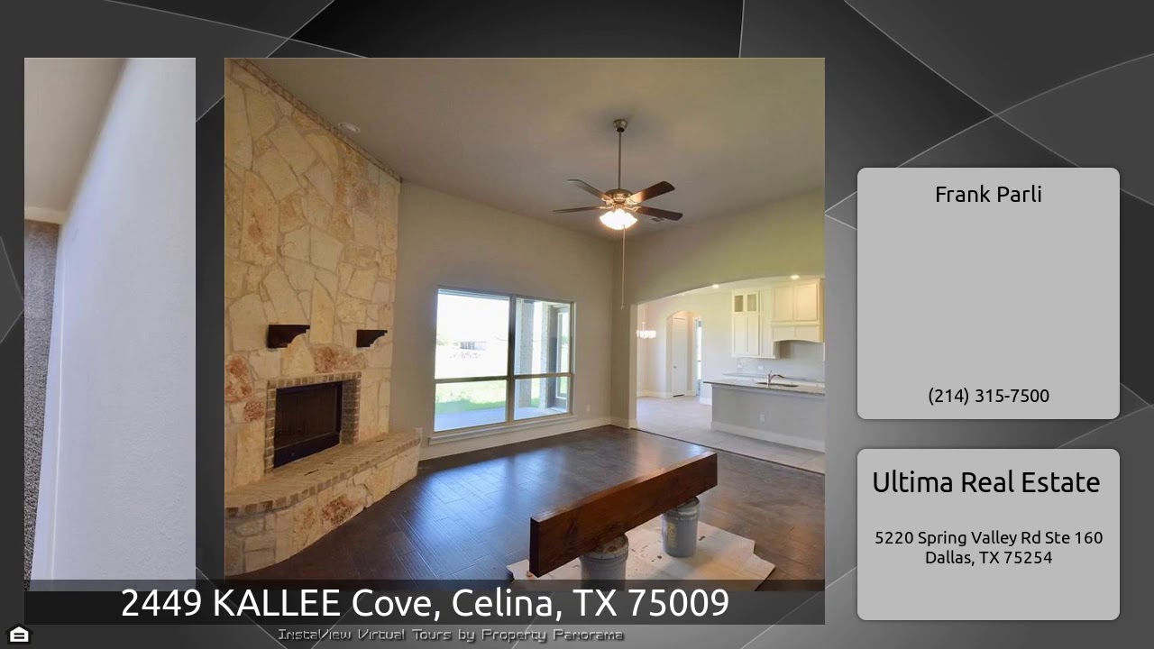 The Virtual Tour for the property at 2449 KALLEE Cove, Celina, TX 75009 listed for $479,000: Other homes for sale by Frank Parli of Ultima Real Estate: Brand New ONE STORY on 1 acre in Celina! No city taxes! Beautiful brick and stone combination. Fantastic layout features HUGE Formal Dining with Panned ceiling, large Study with French Doors, HUGE Family Room with 12' ceiling, 20' x 14' Master Bedroom with 12' ceiling and HUGE closet, great Kitchen with Custom Cabinets and granite tops, 3 large bedrooms, and HUGE 18' x 18' Game Room! Hardwood floors in Entry, Study, F.Dining, Family Room. …
