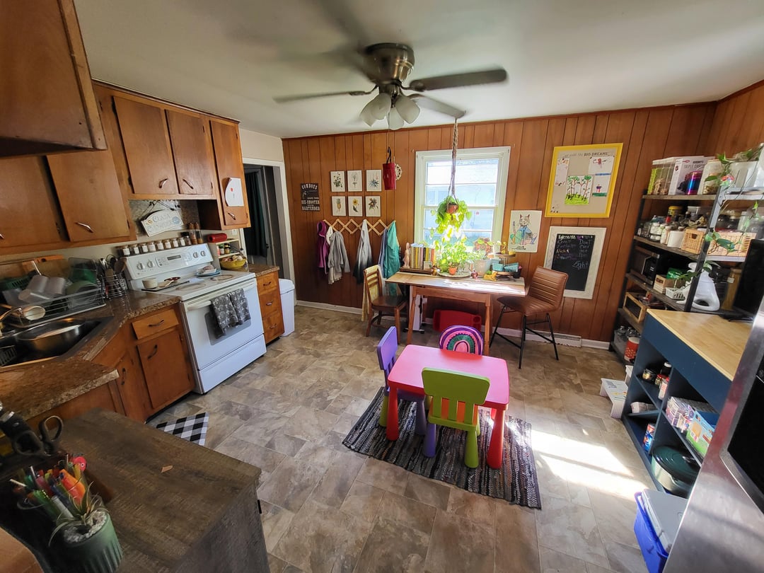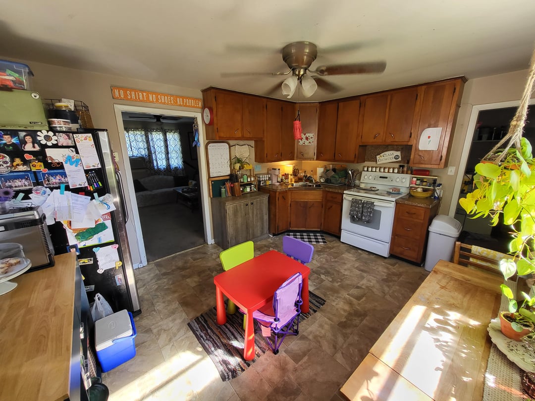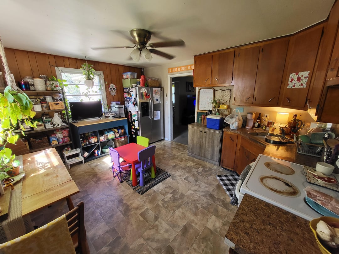 Poor persons kitchen? Wtf? I’m seeing kids drawings on the wall. Family shit all over the fridge. And the kids table being the center of it all.