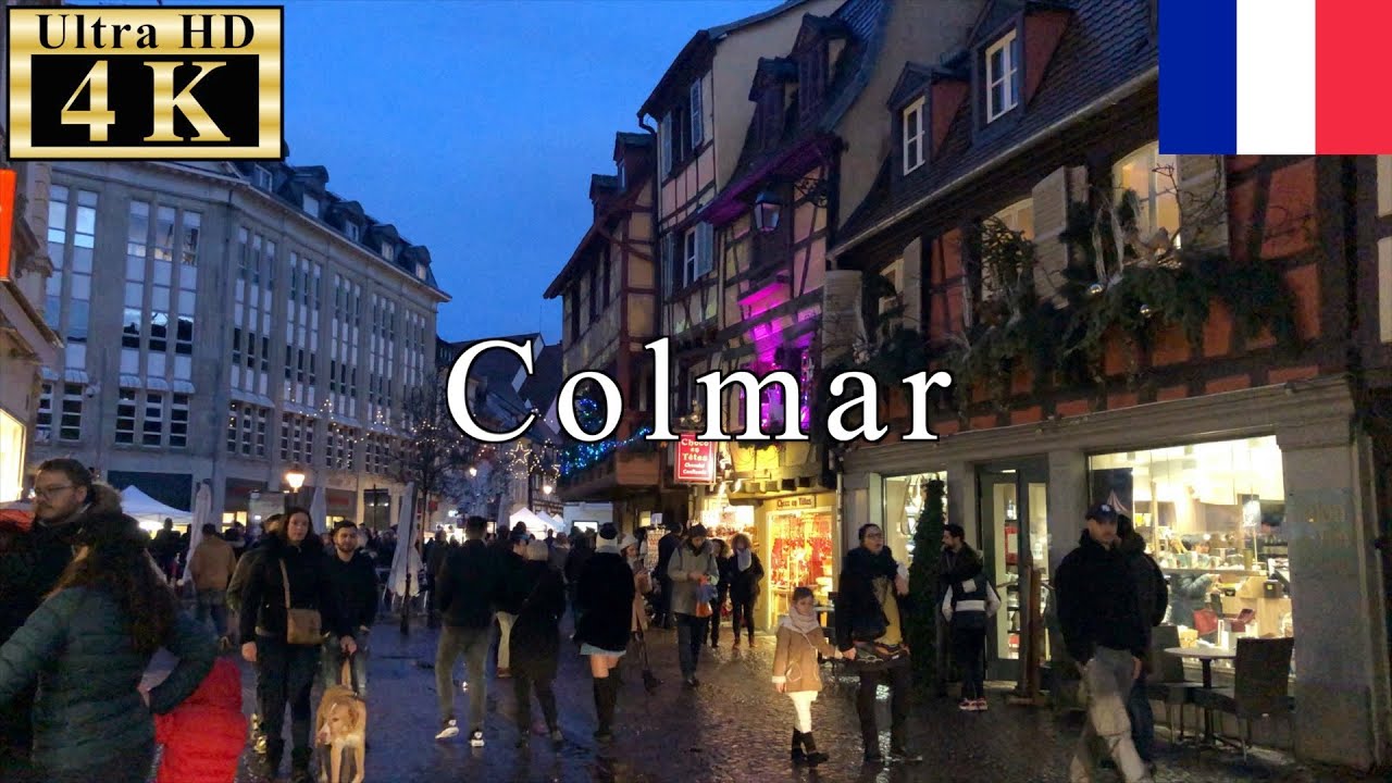 A walk in Colmar at dusk in Christmas Season. the Colmar Christmas Market is the most attractive and atmospheric Christmas markets in all of France.