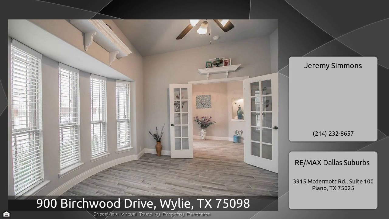 The Virtual Tour for the property at 900 Birchwood Drive, Wylie, TX 75098 listed for $335,000: Other homes for sale by Jeremy Simmons of RE/MAX Dallas Suburbs: Immaculate! Better than new 1 story home in great Wylie location. Wide open living & kitchen w vaulted ceiling. Custom touches abound: Elegant custom aftermarket lighting, stainless appliances, granite thru out, hard surfaces in most of the home. Front study w french doors could be formal dining. Custom designed Master suite w 2 massive closets and room for office space or sitting area. Master bath w sunken shower, granite, soaking …