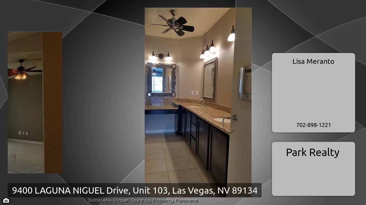 The Virtual Tour for the property at 9400 LAGUNA NIGUEL Drive, Unit 103, Las Vegas, NV 89134 listed for $299,900: Other homes for sale by Lisa Meranto of Park Realty: Views,Views,Views! Premium corner location in prestigious “Terraces” community on TPC Golf Course! One of a kind view of Water & Golf Course! Every imaginable upgrade,Full Size Built-in Wine Chiller,Custom Drapes,Inlay Carpet Design,French Doors,Stone Floor w/Inlays,Gourmet Kitchen,Plantation Shutters,Stone Showers w/Multi Body Wash Jets,Beveled Inlayed Mirrors,Custom Lighting,3 sliders lead to oversize wraparound terrace. Must see!
