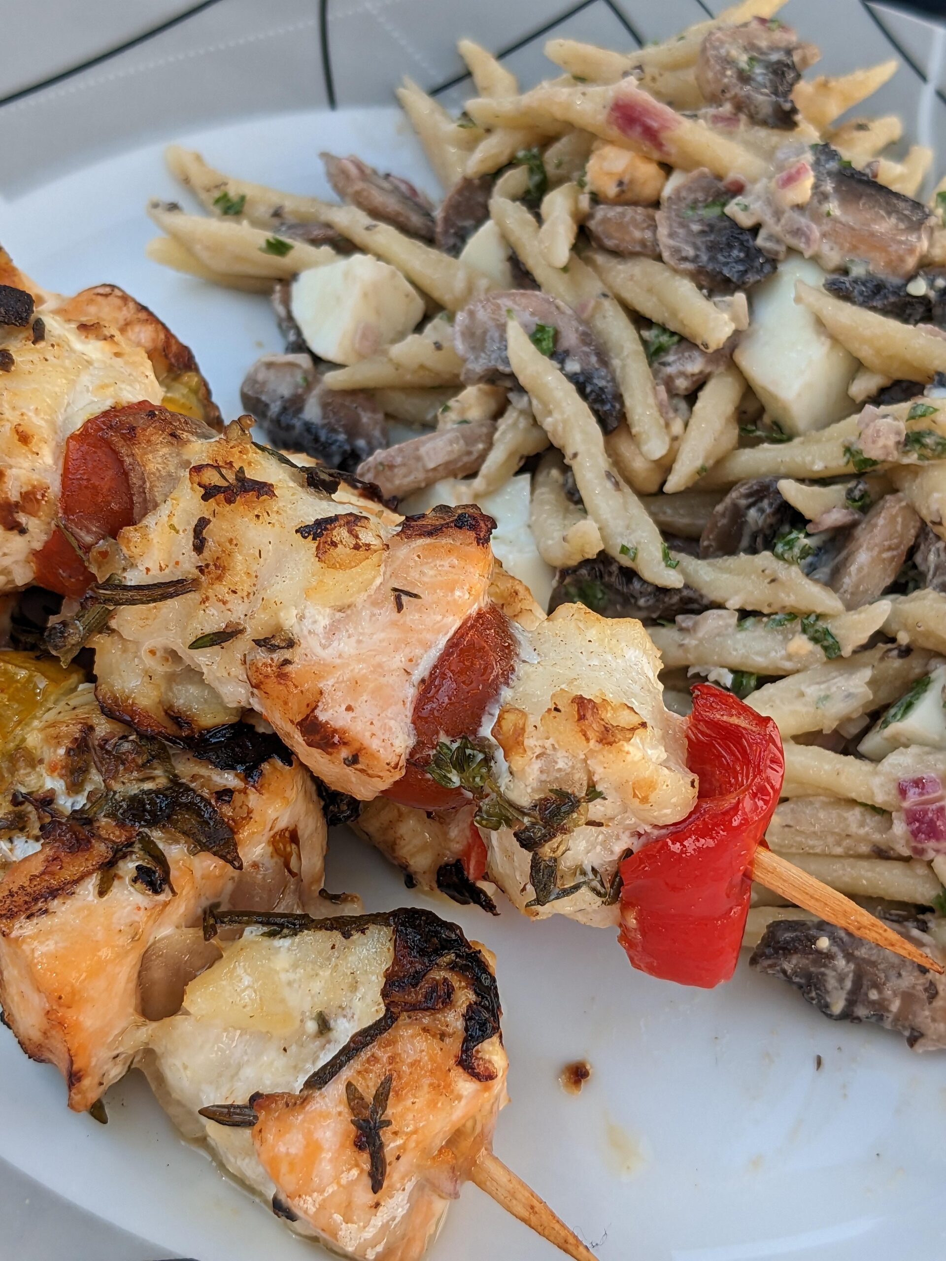 Petites brochettes saumon, lieu noir marinées aux fines herbes et épices et salade de pâtes trofie aux champignons