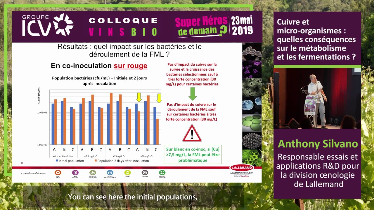 This video (in French, subtitled in English) shows a lecture, given at a conference organized by the ICV on organic wines. Anthony Silvano presents the results of the trials carried out by Lallemand Oenology to investigate the impact of copper on alcoholic and malolactic fermentations.