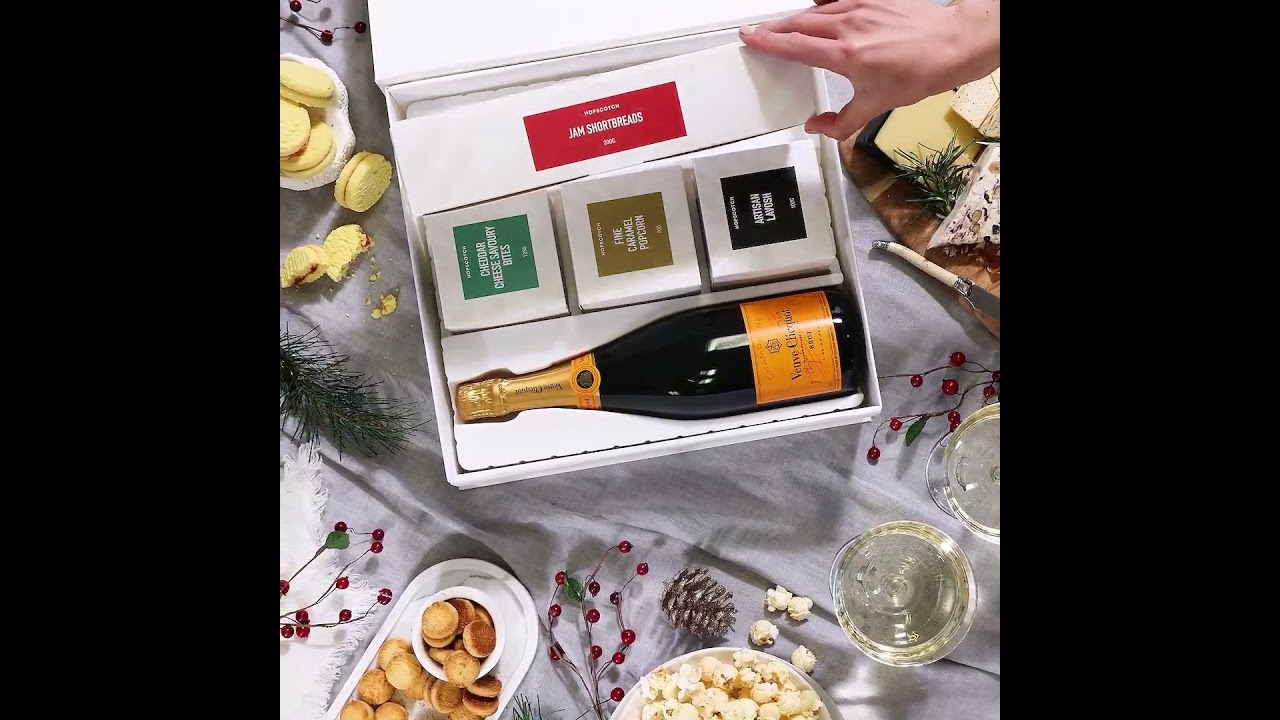 Unveiling the Christmas Veuve Clicquot Epicure, where elegance meets indulgence. From the renowned streets of Reims, France, comes the iconic Veuve Clicquot French Champagne. Its signature Yellow Label boasts crispness, vibrant citrus, and nuanced toastiness that promises to elevate festive merriments. Complementing this are Hopscotch’s gourmet delights. The Artisan Lavosh and Fine Caramel Popcorn provide the perfect crunchy treat, while the Cheddar Cheese Savory Bites add a savory touch. The Raspberry Jam Shortbread Rounds are a sweet, buttery finale. Presented in an elegant white hamper box with a personal gift message card, it’s a refined expression of Christmas joy.