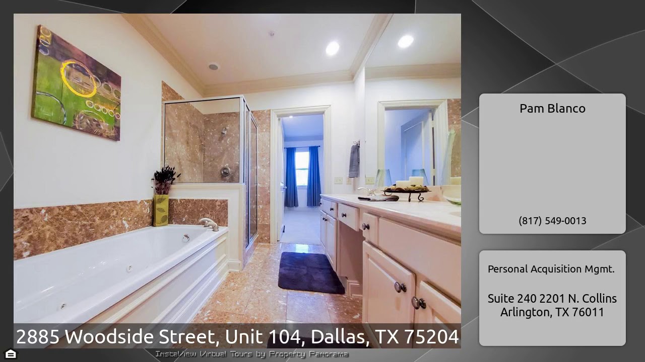 The Virtual Tour for the property at 2885 Woodside Street, Unit 104, Dallas, TX 75204 listed for $410,000: Other homes for sale by Pam Blanco of Personal Acquisition Mgmt.: Beautiful condo in the heart of State-Thomas neighborhood of Uptown overlooking pool and courtyard. Semi-private elevator takes you to your elegant condo featuring a gourmet kitchen with granite counters, SS appliances, five-burner gas cook top and wine fridge. Dbl French doors open to the private urban oasis. Wood floors, 10 ft ceilings, triple crown moldings, security system and luxury master suite with jetted tub and …