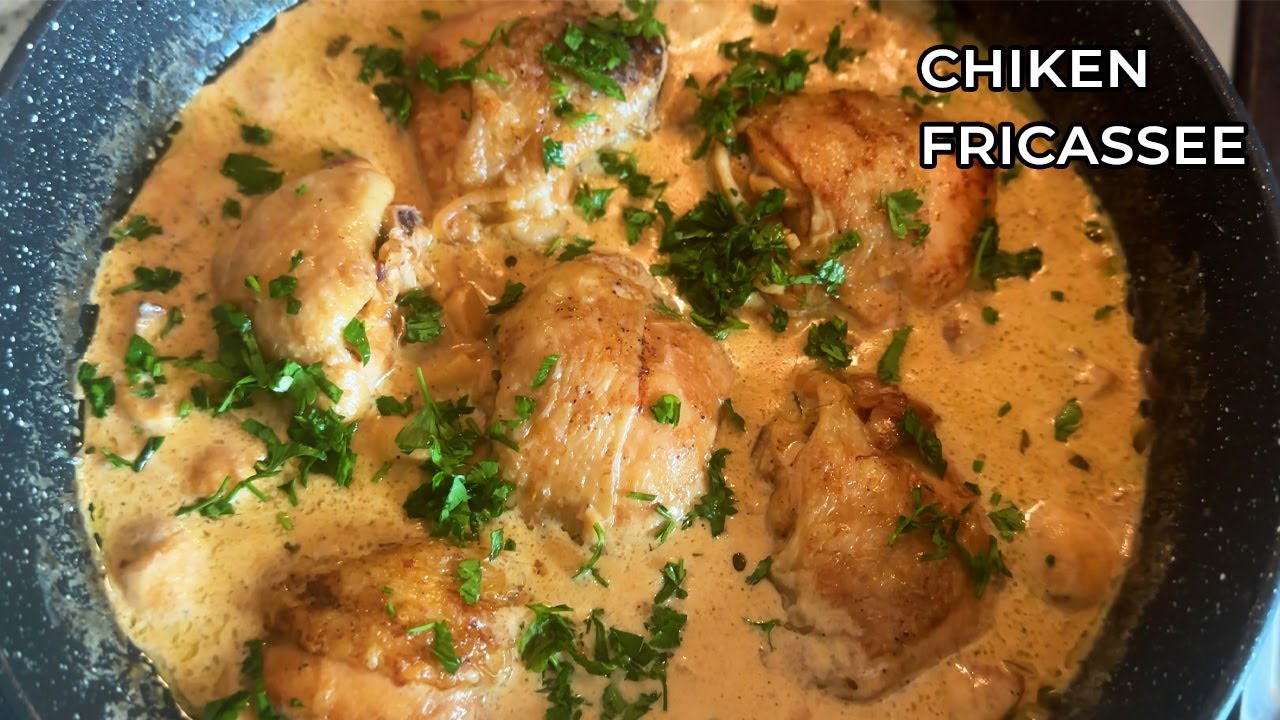 Chicken Fricassée is a traditional French chicken stew made with browned chicken pieces braised in a creamy white mushroom sauce. A rustic family-style meal that’s easy enough for midweek, it’s a bit like a white sauce version of Coq au Vin – except it’s so much faster to make!