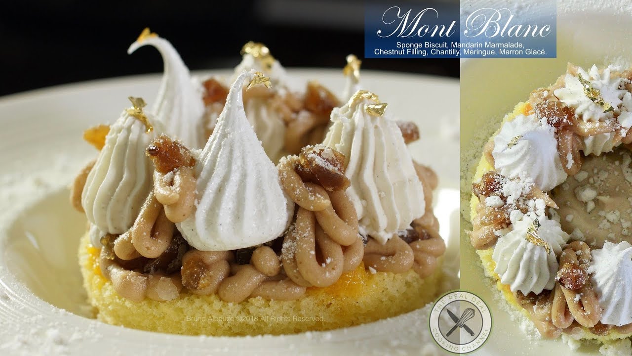 Mont Blanc is a dessert of meringue, pureed chestnuts, whipped cream and marron glacé (candied chestnuts) to resemble of a snow covered mountain. A citrus marmalade is often added to make this dessert even more lucious. For this Mont Blanc recipe the sugar content has been reduced and flavors optimized.