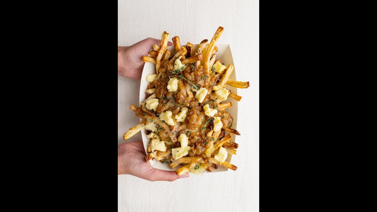 French onion soup, but make it poutine! Cheesy, saucy, and irresistable, this French Onion Poutine takes fries to the next level. Crispy air fryer fries are smothered in a French onion gravy, then topped with Gruyère and cheese curds – these might just be the best fries you’ll ever have. SAVE this recipe!