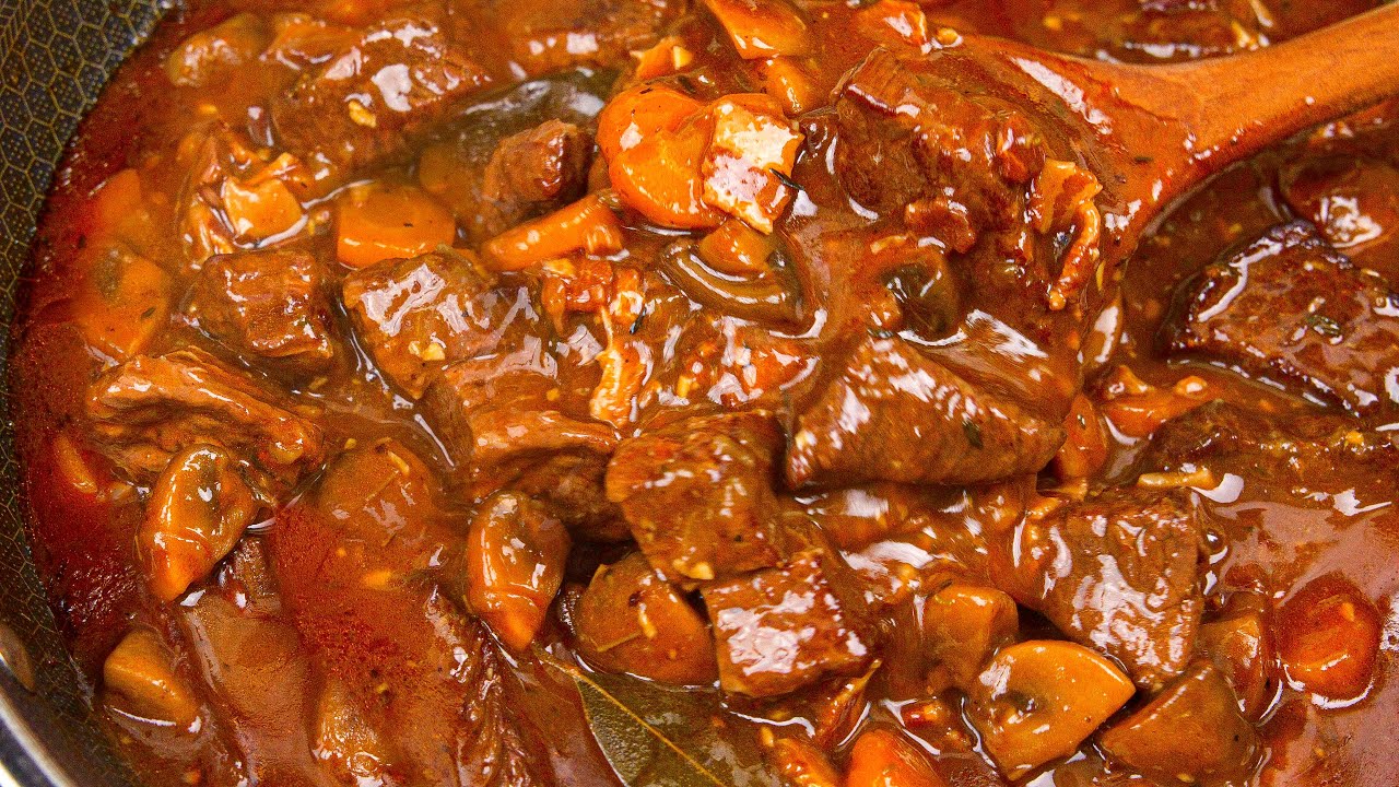 The most famous French recipe, prepared in a simple way! Are you craving a mouthwatering meal that will leave you wanting more? Look no further than this amazing recipe for beef in a delicious red wine sauce with mushrooms! This dish is not only appetizing but also incredibly tasty, as the pieces of beef are stewed in the red wine sauce to perfection.