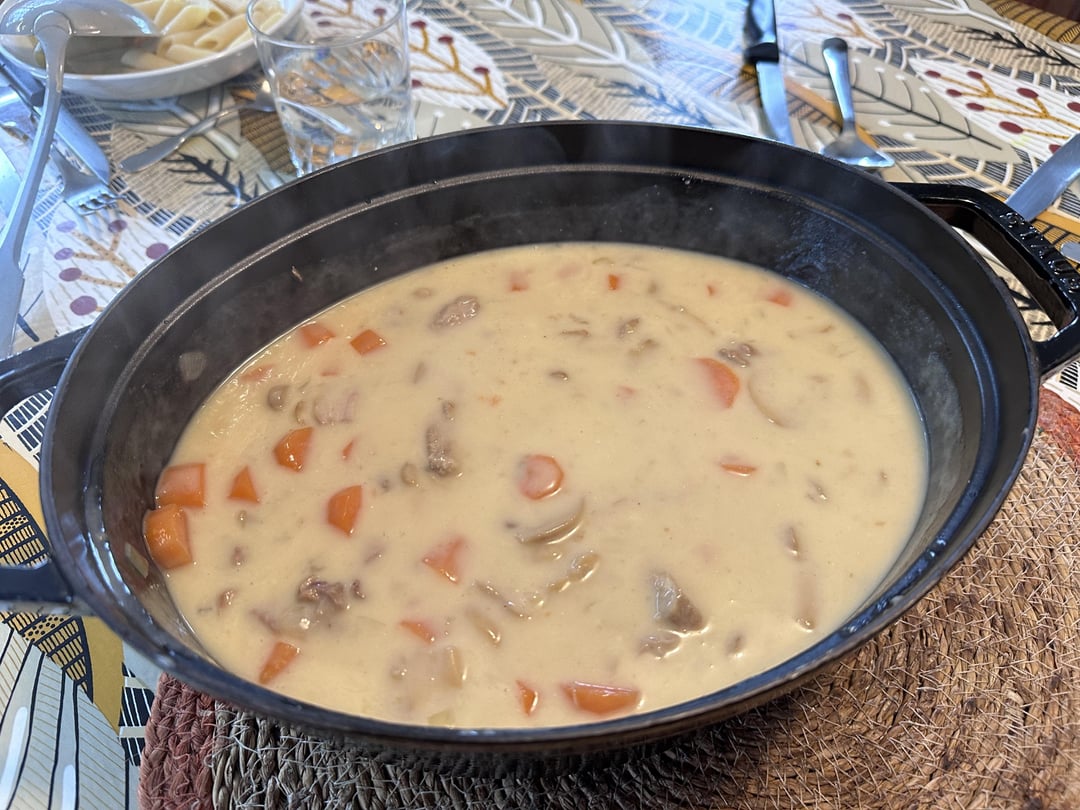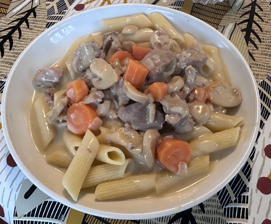 Je trouve que la blanquette se marie mieux avec le riz que les pâtes, mais ça a l’air excellent tout de même !