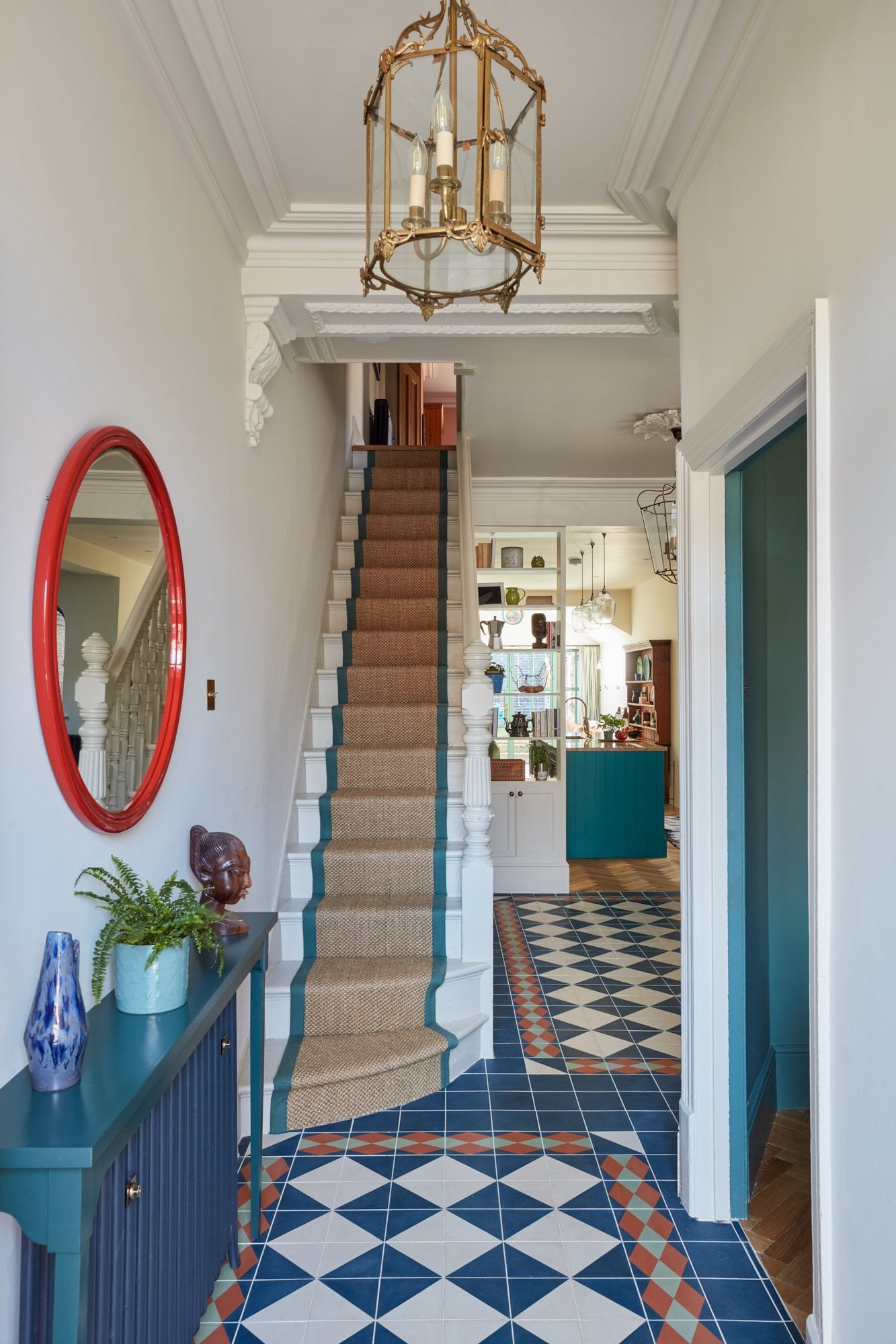 Entrance hallway in a colorfully renovated Victorian terraced house in East London, UK [1333×2000]
