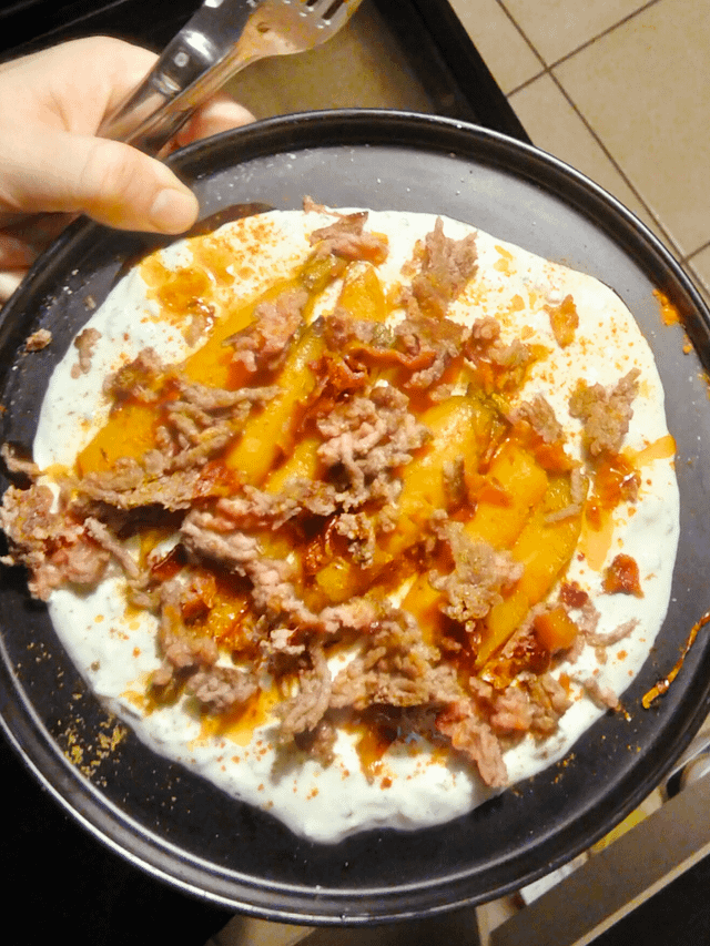 Steak émietté, bacon croustillant en proudre par dessus + poivre blanc et un peu + d’épices